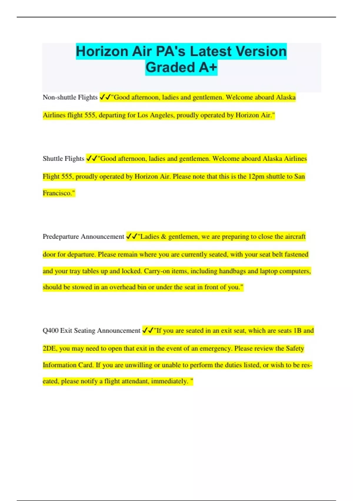 Horizon Air PA's Latest Version Graded A+ Non-shuttle Flights "Good afternoon, ladies and gentlemen. Welcome aboard Alaska Airlines flight 555, departing for Los Angeles, proudly operated by Horizon Air." Shuttle Flights "Good afternoon, ladies and gentlemen. Welcome aboard Alaska Airlines Flight 555, proudly operated by Horizon Air. Please note that this is the 12pm shuttle to San Francisco." Predeparture Announcement "Ladies & gentlemen, we are preparing to close the aircraft door for departure. Please remain where you are currently seated, with your seat belt fastened and your tray tables up and locked. Carry-on items, including handbags and laptop computers, should be stowed in an overhead bin or under the seat in front of you." Q400 Exit Seating Announcement "If you are seated in an exit seat, which are seats 1B and 2DE, you may need to open that exit in the event of an emergency. Please review the Safety Information Card. If you are unwilling or unable to perform the duties listed, or wish to be res- eated, please notify a flight attendant, immediately. " Boarding Doors Closed Announcement "Ladies & gentleman, the aircraft door is now closed. Please make sure your small electronic devices are in airplane mode." Safety Demonstration/Predeparture Announcement -Q400 "Welcome aboard Alaska Airlines flight 555 with service to Portland, proudly operated by Horizon Air. Your flight attendants are me & someone else. We are here to ensure your flight is safe and comfortable. We appreciate your attention as we review the safety features of this aircraft. Please refer to the safety information card, located in the seat pocket in front of you. We are flying aboard a Bombardier Q400. There are 4 clearly marked exits -an exit on the left side, in front of row 1, another exit on the right side at row two, and two exits in the back of the cabin, one on each side. All exits are marked with red and white signs, and there are 2 strips of lighting on the aisle floor. In a dark cabin, the strips mark the route to the exits. To fasten your seat belt, place the flat end into the buckle. Adjust the strap to tighten or lengthen. To release, lift the top of the buckle and pull the belt free. It i After Takeoff Announcement "Thank you for joining us, we have a great flight in store for you. A special welcome to our Mileage Plan members and those of you who have joined us from one of our global airline partners. We want you to stay safe, so please keep your seat belt fastened until the seat belt sign is turned