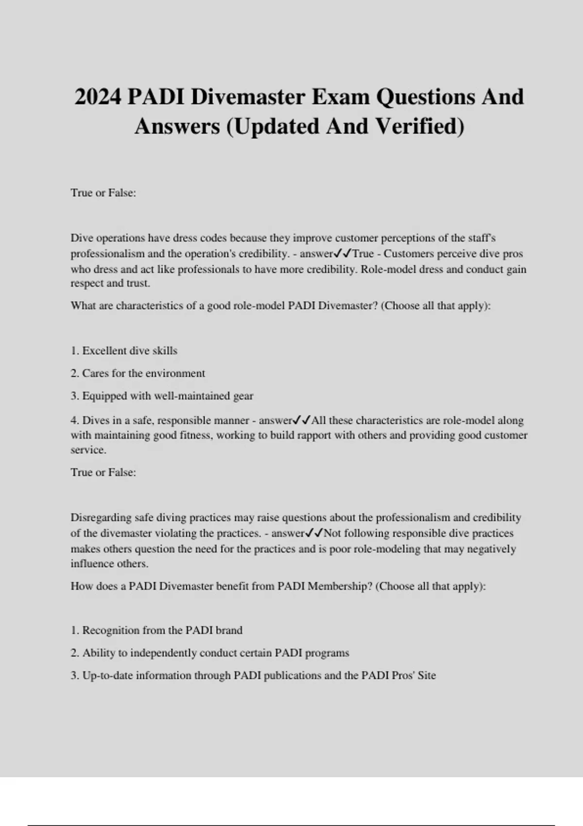 2024 PADI Divemaster Exam Questions And Answers (Updated And Verified) True or False: Dive operations have dress codes because they improve customer perceptions of the staff's professionalism and the operation's credibility. - answerTrue - Customers perceive dive pros who dress and act like professionals to have more credibility. Role-model dress and conduct gain respect and trust. What are characteristics of a good role-model PADI Divemaster? (Choose all that apply): 1. Excellent dive skills 2. Cares for the environment 3. Equipped with well-maintained gear 4. Dives in a safe, responsible manner - answerAll these characteristics are role-model along with maintaining good fitness, working to build rapport with others and providing good customer service. True or False: Disregarding safe diving practices may raise questions about the professionalism and credibility of the divemaster violating the practices. - answerNot following responsible dive practices makes others question the need for the practices and is poor role-modeling that may negatively influence others. How does a PADI Divemaster benefit from PADI Membership? (Choose all that apply): 1. Recognition from the PADI brand 2. Ability to independently conduct certain PADI programs 3. Up-to-date information through PADI publications and the PADI Pros' Site 4. Business and professional support from PADI Regional Headquarters - answerAll of these are benefits of being a member of PADI, the world's largest professional diver training organization. As a PADI Divemaster, you agree to follow PADI Standards and (choose one): 1. enroll in a PADI IDC after getting two years of experience. 2. adhere to the PADI Member Code of Practice. 3. teach only local divers. 4. renew your rating only if planning to assist with classes. - answer2. adhere to the PADI Member Code of Practice. Your responsibility is to follow PADI Standards and to adhere to the Code of Practice found in the Commitment to Excellence section of the PADI Instructor Manual. During the PADI Divemaster course, your instructor will become a(n) ___________ who treats you like a protégé. 1. student 2. lecturer 3. mentor 4. intern - answer3. mentor Rather than a typical student-teacher relationship, your relationship will ideally become more of a mentor-protégé relationship. In a mentor relationship, your instructor doesn't just give information, but is a coach and advisor who explains judgment calls, who listens to what's on your mind and wants to know what you're thinking and why. Experts in a given field are better able to solve problems than nonexperts because they (choose all that apply) 1. have a large knowledge and experience base to draw upon. 2. can better recognize factors involved and define the problem. 3. have dealt with similar problems. 4. are more creative and clever. - answer1. have a large knowledge and experience base to draw upon. 2. can better recognize factors involved and define the problem. 3. have dealt with similar problems. Experts draw upon their more extensive knowledge base to better recognize relationships between the factors involved, thus more quickly define the problem. Experts may have already dealt with a problem before and can apply a known remedy. What additional training may help you as a PADI Divemaster? (Choose all that apply.) 1. PADI Specialty Diver and Specialty Instructor courses 2. PADI TecRec courses 3. Business and sales training 4. Scuba equipment repair training 5. Discover Scuba Diving Leader Internship - answerAll of this training is beneficial along with other dive-related, boating and equipment training. As a divemaster, your role is generally to provide __________ planning that other divers use to plan their individual buddy team dives within. 1. complete 2. broad 3. detailed - answer2. broad You provide broad planning for the group because you know the dive site and local environment. By supplying guidelines, you allow divers to plan their individual dives. Wind can affect dive conditions in which of the following ways? (Choose all that apply.) 1. Cause currents 2. Cause upwelling that affects water temperature and visibility 3. Generate waves and surge 4. Prevent overheating at the surface - answer1. Cause currents 2. Cause upwelling that affects water temperature and visibility 3. Generate waves and surge Wind can cause waves, surf, surge and surface currents plus poor visibility. Offshore wind can calm surf and cause an upwelling and good visibility. The primary reason for having and using accounting procedures is to be sure every diver returns from the dive. Incident reports indicate that problems with this usually result from: 1. using an inaccurate accounting procedure. 2. divers refusing to participate in roll calls. 3. failure to use an accounting procedure at all. - answer3. failure to use an accounting procedure at all. Incident reports indicate that in the few cases where divers have been left behind, the likely cause isn't faulty accounting procedures, but rather failure to use a procedure. Which of the following are examples of responsible diver behavior? (Choose all that apply): 1. Planning dives within the limits of training and experience. 2. Diving regularly to the maximum depth and air supply limits. 3. Having the proper equipment for the dive and making sure it is working properly before getting in the water. 4. Taking care to avoid contact with sensitive aquatic life and respecting the underwater environment. - answer1. Planning dives within the limits of training and experience. 3. Having the proper equipment for the dive and making sure it is working properly before getting in the water. 4. Taking care to avoid contact with sensitive aquatic life and respecting the underwater environment. A diver displaying responsible behavior will stay within personal limits and plan dives within limits of training; use equipment required for a dive, maintain it properly, and check it before