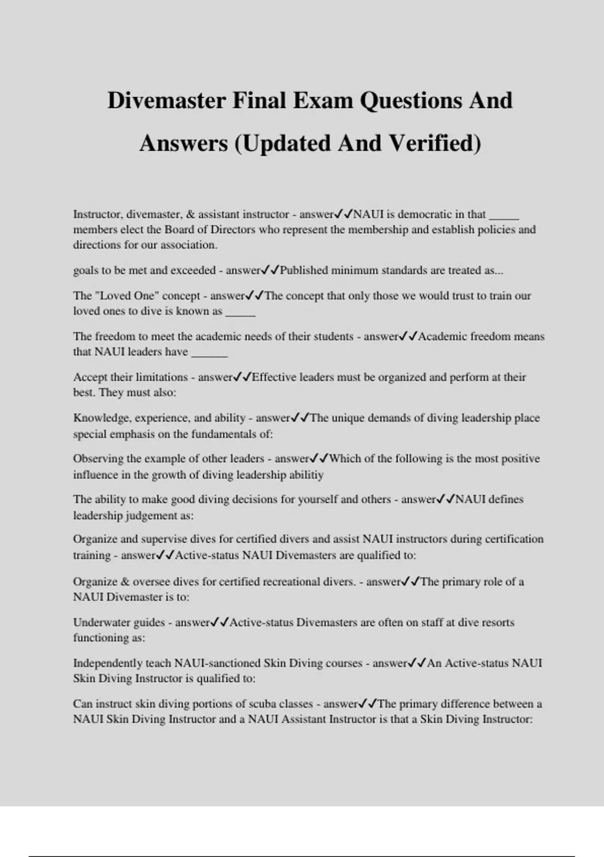 Divemaster Final Exam Questions And Answers (Updated And Verified) Instructor, divemaster, & assistant instructor - answerNAUI is democratic in that _____ members elect the Board of Directors who represent the membership and establish policies and directions for our association. goals to be met and exceeded - answerPublished minimum standards are treated as... The "Loved One" concept - answerThe concept that only those we would trust to train our loved ones to dive is known as _____ The freedom to meet the academic needs of their students - answerAcademic freedom means that NAUI leaders have ______ Accept their limitations - answerEffective leaders must be organized and perform at their best. They must also: Knowledge, experience, and ability - answerThe unique demands of diving leadership place special emphasis on the fundamentals of: Observing the example of other leaders - answerWhich of the following is the most positive influence in the growth of diving leadership abilitiy The ability to make good diving decisions for yourself and others - answerNAUI defines leadership judgement as: Organize and supervise dives for certified divers and assist NAUI instructors during certification training - answerActive-status NAUI Divemasters are qualified to: Organize & oversee dives for certified recreational divers. - answerThe primary role of a NAUI Divemaster is to: Underwater guides - answerActive-status Divemasters are often on staff at dive resorts functioning as: Independently teach NAUI-sanctioned Skin Diving courses - answerAn Active-status NAUI Skin Diving Instructor is qualified to: Can instruct skin diving portions of scuba classes - answerThe primary difference between a NAUI Skin Diving Instructor and a NAUI Assistant Instructor is that a Skin Diving Instructor: