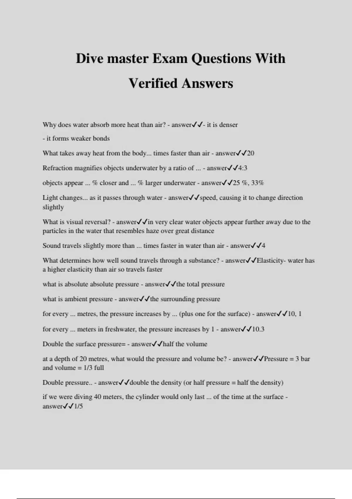 Dive master Exam Questions With Verified Answers Why does water absorb more heat than air? - answer- it is denser - it forms weaker bonds What takes away heat from the body... times faster than air - answer20 Refraction magnifies objects underwater by a ratio of ... - answer4:3 objects appear ... % closer and ... % larger underwater - answer25 %, 33% Light changes... as it passes through water - answerspeed, causing it to change direction slightly What is visual reversal? - answerin very clear water objects appear further away due to the particles in the water that resembles haze over great distance Sound travels slightly more than ... times faster in water than air - answer4 What determines how well sound travels through a substance? - answerElasticity- water has a higher elasticity than air so travels faster what is absolute absolute pressure - answerthe total pressure what is ambient pressure - answerthe surrounding pressure for every ... metres, the pressure increases by ... (plus one for the surface) - answer10, 1 for every ... meters in freshwater, the pressure increases by 1 - answer10.3 Double the surface pressure= - answerhalf the volume at a depth of 20 metres, what would the pressure and volume be? - answerPressure = 3 bar and volume = 1/3 full Double pressure.. - answerdouble the density (or half pressure = half the density) if we were diving 40 meters, the cylinder would only last ... of the time at the surface - answer1/5 What is the amount of buoyancy based off? - answerhow much fluid the object displaces compared to its weight how do you increase buoyancy? - answerreducing weight and increasing displacement how do we calculate partial pressure? - answermultiply the percentage of the gas by the pressure dpeth what is the partial pressure of oxygen set at? - answer1.4 bar for recreational diving what is saturation - answerthe pressure of the dissolved gas will equalize with the pressure of the gas in contact with the liquid What is supersaturation? - answerwhen pressure decreases the dissolved gas begins to come out of the solution what is dead air space and why is it a concern? - answergas that remains in ur sinuses and doesnt participate in gas exchange. When you breathe shallow and rapid the proportion of dead air space increases leading to increased carbon dioxide levels Why is carbon monoxide poisonous? - answerbecause it binds with haemoglobin (which oxygen normally binds too), reducing the ability to carry adeqaute oxygen around the body what are the two types of oxygen toxicity? - answer1. central nervous system toxicity 2. pulmonary toxicity what is the acronym used for CNS toxicity? - answerVentid visual disturbance ears ringing nausea twitching irritability dizziness why does gas narcosis occur? - answerresults from has blocking/delaying the transmission of signals within the nervous system which type of decompression sickness is the most life threatening? - answertype 2 DCS What are the signs of heat stroke? - answerPerspiration stops and the persons skin is hot and flush, pulse is rapid and strong