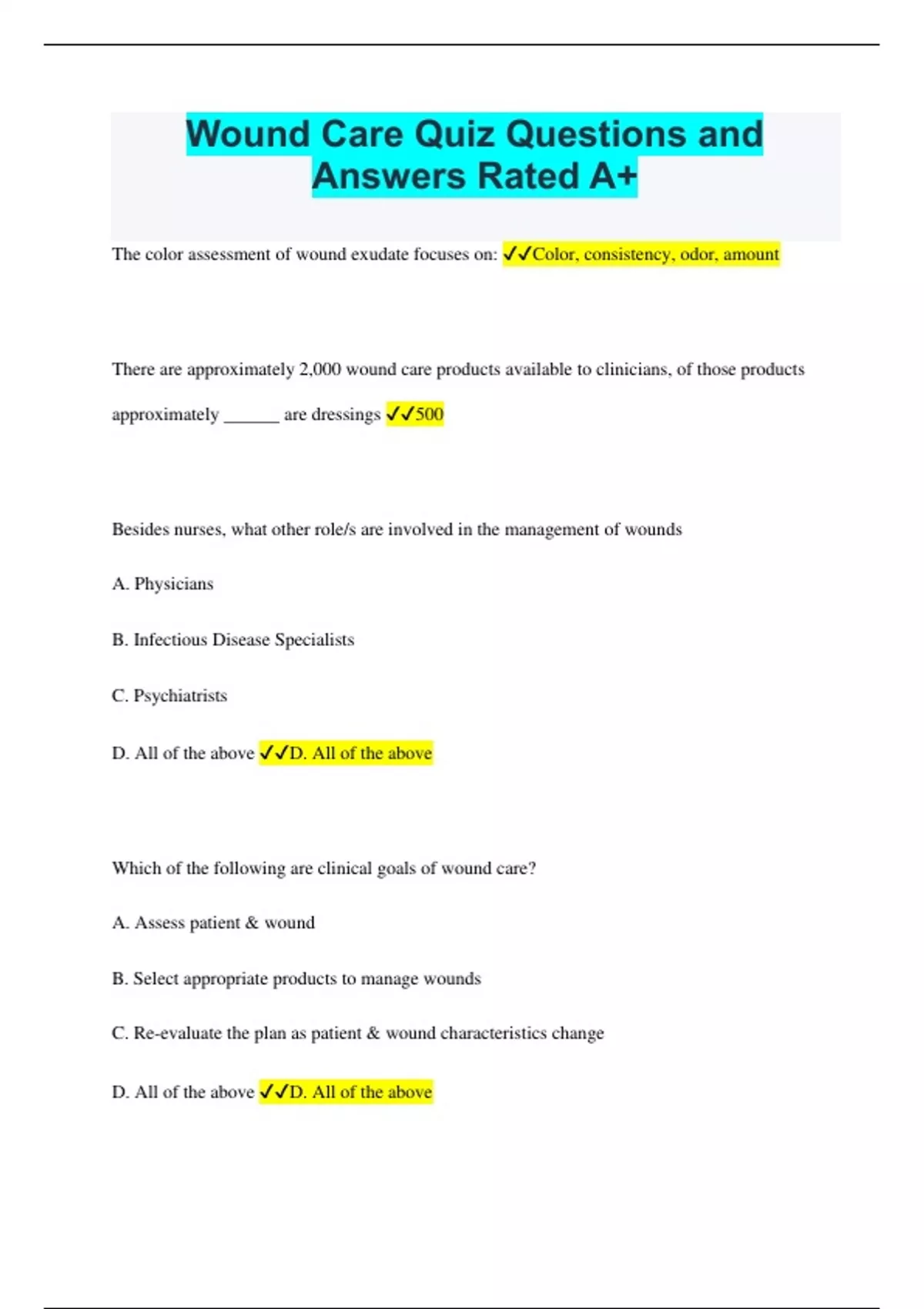 Wound Care Quiz Questions and Answers Rated A+ The color assessment of wound exudate focuses on: Color, consistency, odor, amount There are approximately 2,000 wound care products available to clinicians, of those products approximately ______ are dressings 500 Besides nurses, what other role/s are involved in the management of wounds A. Physicians B. Infectious Disease Specialists C. Psychiatrists D. All of the above D. All of the above Which of the following are clinical goals of wound care? A. Assess patient & wound B. Select appropriate products to manage wounds C. Re-evaluate the plan as patient & wound characteristics change D. All of the above D. All of the above Treatment for wounds with large amount of exudate include (select all that apply): A. Hydrofiber B. Calcium Alginate C. Foam D. Transparent film E. Neg Pressure A, B, C, D The purpose of debridement is to return the wound to the ___ phase and establish a viable wound bed A. Proliferation B. Hemostasis C. Inflammatory D. Maturation C. Inflammatory Which is NOT a basic principle of wound management: A. Minimize trauma B. Assess & manage wounds C. Remove Infection D. Apply pressure to wound D. Apply pressure to the wound Thick and Sticky Exudate indicates the presence of infection.