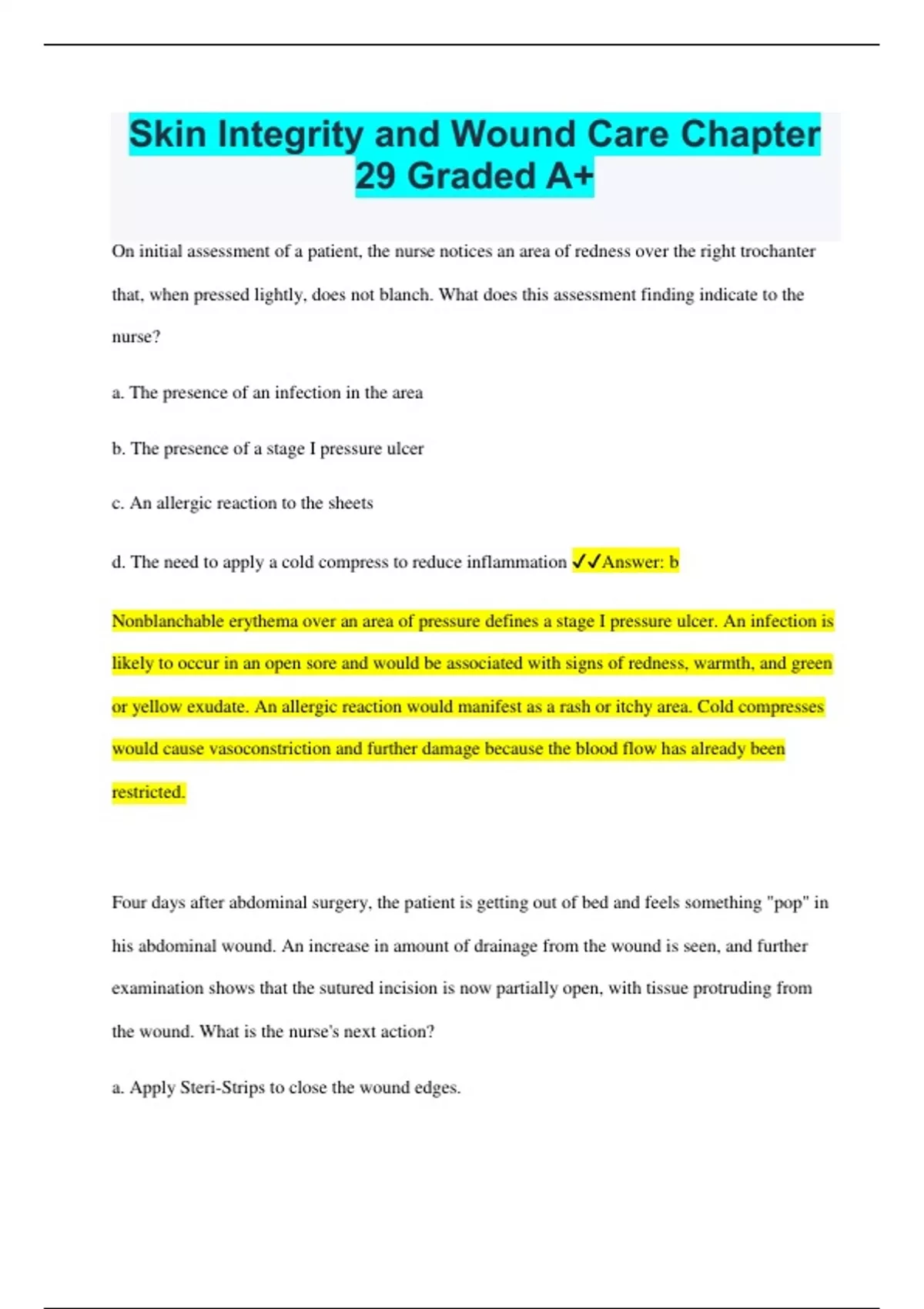 Skin Integrity and Wound Care Chapter 29 Graded A+ On initial assessment of a patient, the nurse notices an area of redness over the right trochanter that, when pressed lightly, does not blanch. What does this assessment finding indicate to the nurse? a. The presence of an infection in the area b. The presence of a stage I pressure ulcer c. An allergic reaction to the sheets d. The need to apply a cold compress to reduce inflammation Answer: b Nonblanchable erythema over an area of pressure defines a stage I pressure ulcer. An infection is likely to occur in an open sore and would be associated with signs of redness, warmth, and green or yellow exudate. An allergic reaction would manifest as a rash or itchy area. Cold compresses would cause vasoconstriction and further damage because the blood flow has already been restricted. Four days after abdominal surgery, the patient is getting out of bed and feels something "pop" in his abdominal wound. An increase in amount of drainage from the wound is seen, and further examination shows that the sutured incision is now partially open, with tissue protruding from the wound. What is the nurse's next action? a. Apply Steri-Strips to close the wound edges. b. Cover the wound with saline-moistened gauze, and notify the physician. c. Assure the patient that this is common, and document the findings. d. Apply a binder to pull the wound edges together and provide support to the edges. Answer: b This is likely to be an evisceration of the surgical wound and, as such, may require surgical intervention. The normal saline keeps the wound and tissue moist until they can be evaluated by the physician. Steri-Strips can be used to reinforce a closed wound when sutures or staples are removed but are not used to try to close a wound that has opened and has tissue protruding through. False reassurance should not be given. A binder is used to support a closed incision and should not be applied to a wound with tissue protruding. Which features are characteristic of a closed drainage system such as a Jackson-Pratt (JP) drain? (Select all that apply.) a. Works by gravity b. Provides for early discharge c. Usually is inserted in surgery d. Reduces the amount of antibiotics required e. Allows for accurate measurement of wound drainage f. Allows bacteria to migrate up the drain from the surrounding dressing Answers: c, e JP drains usually are inserted at surgery. Unlike an open drainage device such as the Penrose drain, a JP drain does not allow drainage to soak into the surrounding dressing and allows for an accurate measurement of the drainage. JP drains work by suction, not gravity. Discharge and antibiotic use are not dependent on the type of drain. Bacteria migration from the dressing will not occur because a JP drain is a closed system.