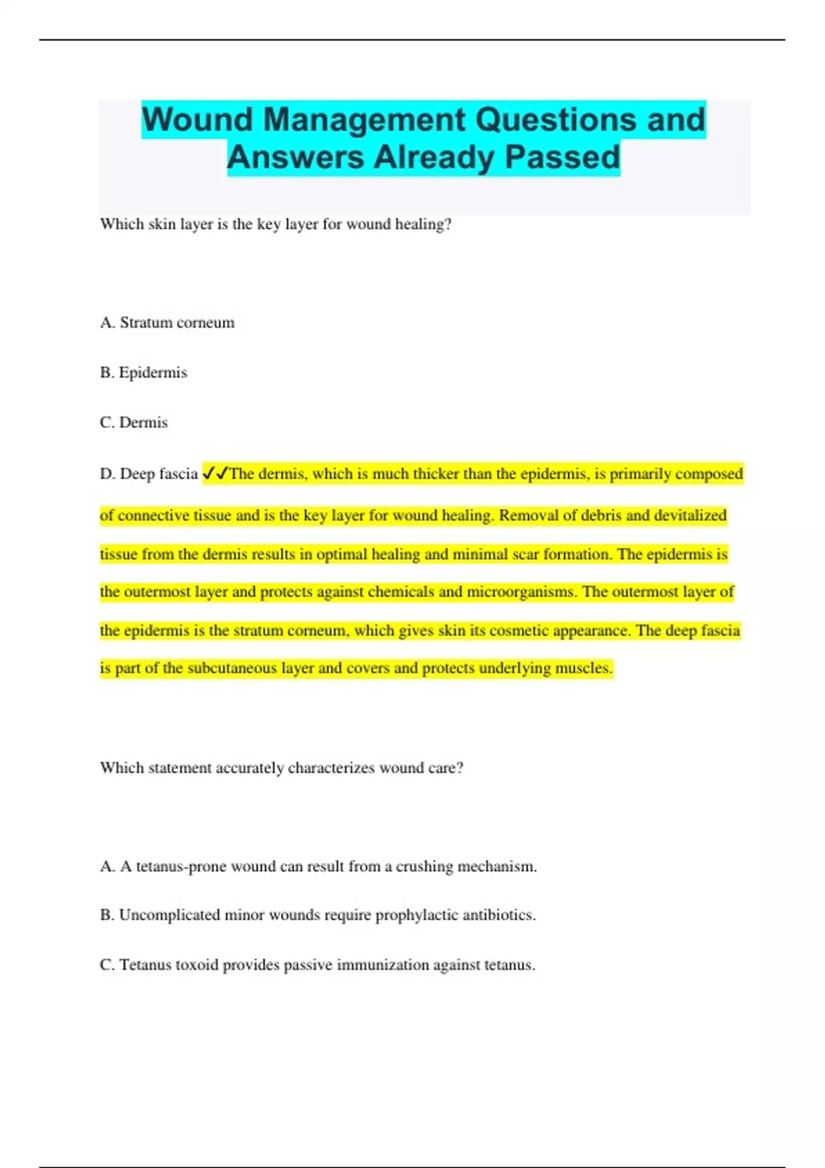 Wound Management Questions and Answers Already Passed Which skin layer is the key layer for wound healing? A. Stratum corneum B. Epidermis C. Dermis D. Deep fascia The dermis, which is much thicker than the epidermis, is primarily composed of connective tissue and is the key layer for wound healing. Removal of debris and devitalized tissue from the dermis results in optimal healing and minimal scar formation. The epidermis is the outermost layer and protects against chemicals and microorganisms. The outermost layer of the epidermis is the stratum corneum, which gives skin its cosmetic appearance. The deep fascia is part of the subcutaneous layer and covers and protects underlying muscles. Which statement accurately characterizes wound care? A. A tetanus-prone wound can result from a crushing mechanism. B. Uncomplicated minor wounds require prophylactic antibiotics. C. Tetanus toxoid provides passive immunization against tetanus. D. The most effective intervention to reduce the risk of infection is antibiotic administration. A tetanus-prone wound can result from a crushing mechanism. Tetanus-prone wounds also include those that are more than 6 hours old, are stellate or avulsed, are caused by missiles, show obvious signs of infection, have devitalized tissue, or contain contaminants, such as dirt, feces, soil, or saliva. Uncomplicated minor wounds do not require prophylactic antibiotics. Meticulous wound care, debridement, proper wound closure, and dressings are the most important infection- control techniques for minor wounds. Tetanus toxoid provides active immunization, whereas tetanus immune globulin (TIG) provides passive immunization. The most effective intervention to reduce the risk of infection is thorough wound cleansing. The use of antibiotics for all acute wounds is controversial. Which injury is a severe avulsion? A. Road rash B. Degloving C. Compartment syndrome D. Abscess A degloving injury is a severe avulsion in which the skin is peeled away from the hand, foot, or a greater portion of an extremity. This injury results in devascularization of the skin and underlying tissue damage. Road rash is the most severe of all abrasions. Compartment syndrome results when extensive extremity contusions or a puncture wound into the fascia causes compression of the nerves and blood vessels in an enclosed space. An abscess is a localized collection of pus beneath the skin. Which intervention is appropriate for a patient with a large "road rash" on the leg from a motorcycle crash? A. Procedural sedation B. Wound infiltration C. Topical anesthetic application D. Local nerve block administration The most severe of all abrasions is a "road rash." This may result in almost 100% tissue loss and, in extreme cases, requires care at a burn center. Because of the extent of this injury, procedural