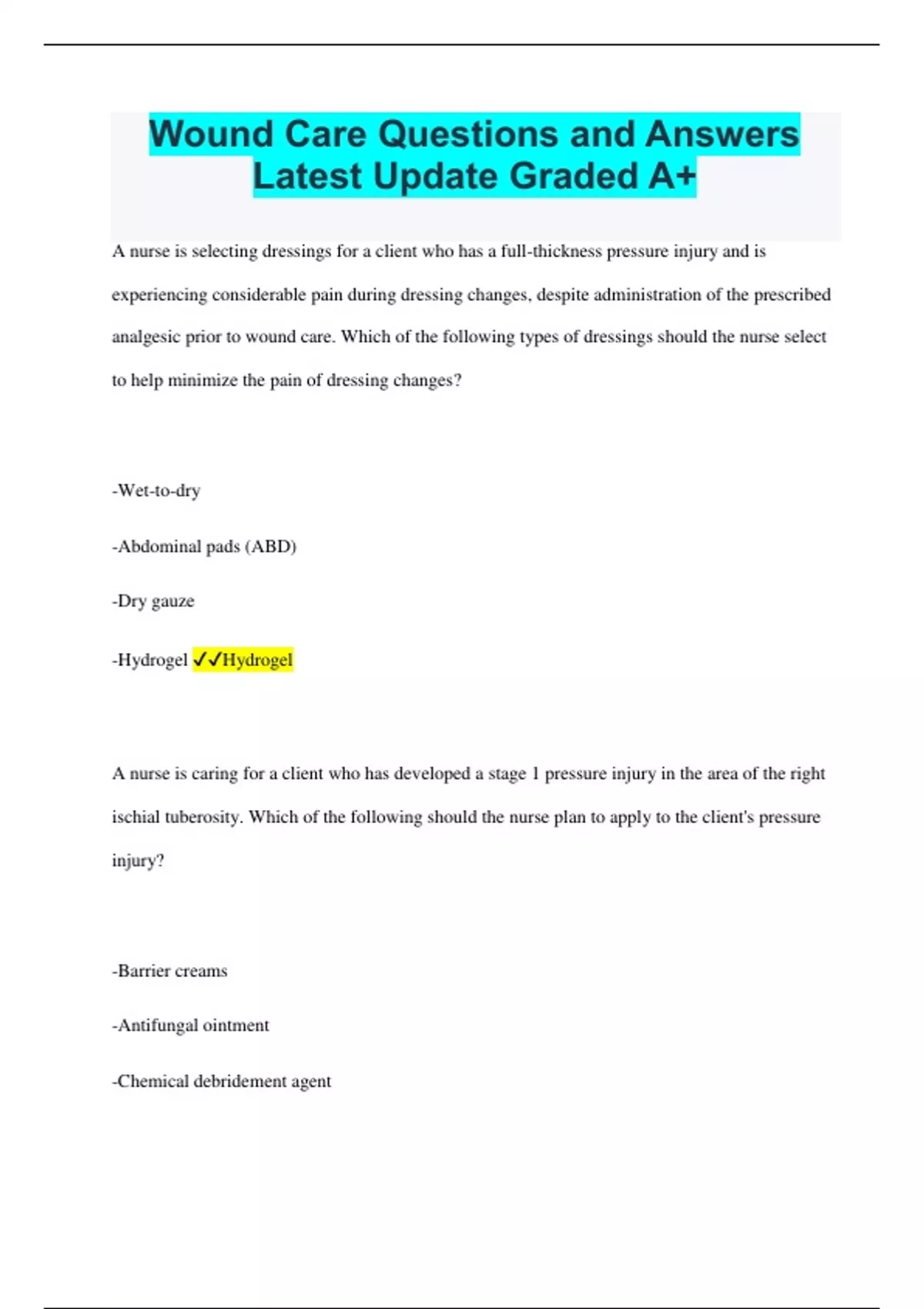 Wound Care Questions and Answers Latest Update Graded A+ A nurse is selecting dressings for a client who has a full-thickness pressure injury and is experiencing considerable pain during dressing changes, despite administration of the prescribed analgesic prior to wound care. Which of the following types of dressings should the nurse select to help minimize the pain of dressing changes? -Wet-to-dry -Abdominal pads (ABD) -Dry gauze -Hydrogel Hydrogel A nurse is caring for a client who has developed a stage 1 pressure injury in the area of the right ischial tuberosity. Which of the following should the nurse plan to apply to the client's pressure injury? -Barrier creams -Antifungal ointment -Chemical debridement agent -Antibiotic agent Barrier creams A nurse is planning care for a client who has multiple wounds. During the initial stage of wound healing, which of the following should the nurse include in the plan of care? -Leave nonbleeding wounds open to the air. -Administer a corticosteroid medication. -Initiate mechanical debridement. -Apply oxygen at 2 L/min via nasal cannula. Apply oxygen at 2 L/min via nasal cannula. A nurse is caring for a client who has multiple sclerosis and a chronic nonhealing wound. The nurse should recognize that which of the following types of medications is known to delay wound healing? -Tricyclic antidepressants -Corticosteroids -Beta blockers -Anticholinergics Corticosteroids