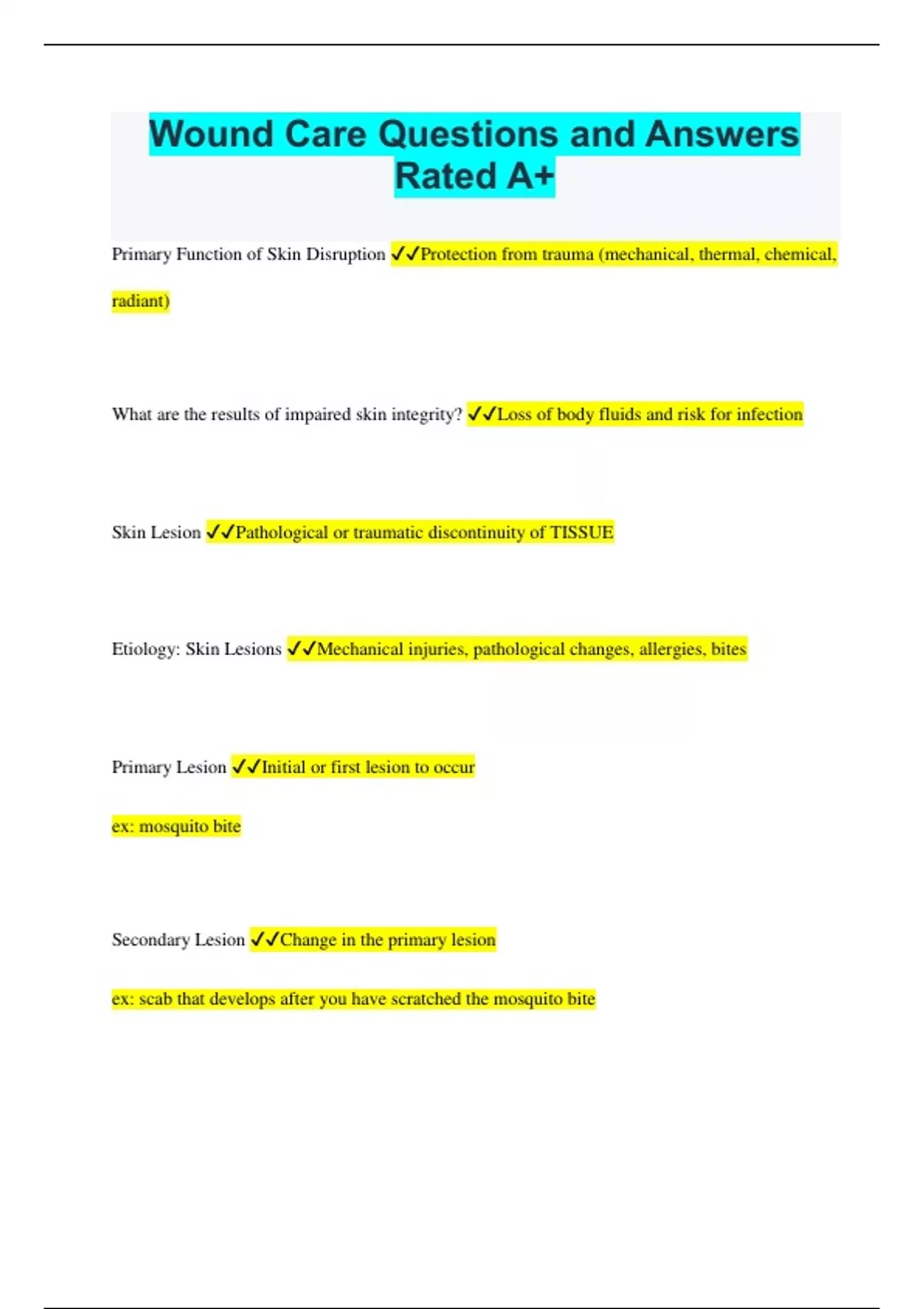 Wound Care Questions and Answers Rated A+ Primary Function of Skin Disruption Protection from trauma (mechanical, thermal, chemical, radiant) What are the results of impaired skin integrity? Loss of body fluids and risk for infection Skin Lesion Pathological or traumatic discontinuity of TISSUE Etiology: Skin Lesions Mechanical injuries, pathological changes, allergies, bites Primary Lesion Initial or first lesion to occur ex: mosquito bite Secondary Lesion Change in the primary lesion ex: scab that develops after you have scratched the mosquito bite Wound Disruption in the structure and function of the skin from bodily injury or disease Intentional Wounds Wounds that occur from surgical procedures or treatments Unintentional Wound Wound that occurs from accidental injuries or trauma, adverse effects of health care Open Wound An injury in which the skin is INTERRUPTED or disrupted, EXPOSING the tissue beneath. Closed Wound Bruising underneath the skin Clean Wound Wound that is created with CLEAN surgical instruments; Microbes have not entered the wound. Contaminated Wound Wound with presence of microorganisms, dirt, debris, exudate Acute Wound Wound that heals in orderly and timely process; i.e. surgical incision Chronic Wound Wound that heals slowly and has an insidious onset; i.e. DPU Types of Wounds Open vs Closed Clean vs Contaminated Acute vs Chronic