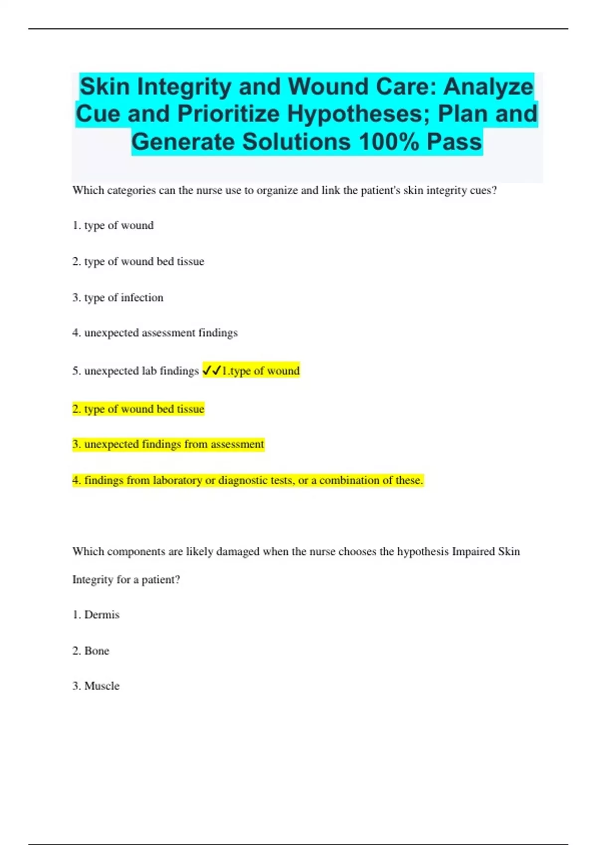 Skin Integrity and Wound Care: Analyze Cue and Prioritize Hypotheses; Plan and Generate Solutions 100% Pass Which categories can the nurse use to organize and link the patient's skin integrity cues? 1. type of wound 2. type of wound bed tissue 3. type of infection 4. unexpected assessment findings 5. unexpected lab findings of wound 2. type of wound bed tissue 3. unexpected findings from assessment 4. findings from laboratory or diagnostic tests, or a combination of these. Which components are likely damaged when the nurse chooses the hypothesis Impaired Skin Integrity for a patient? 1. Dermis 2. Bone 3. Muscle 4. Tendon 5. Epidermis 6. Subcutaneous tissue 1. dermis 2. epidermis Which hypothesis would the nurse select for a patient with a breakdown in the dermis from external forces? 1. Impaired Skin Integrity 2. Risk for Impaired Skin Integrity 3. Impaired Tissue Integrity 4. Burn Wound 1. Impaired skin integrity Which patient would the nurse see first after receiving report? 1. A patient with a profusely bleeding wound 2. A patient with a wound dehiscence 3. A patient with an early wound infection 4. A patient experiencing a wound from a surgical incision 1. A patient with profusely bleeding wound Which overall goal would the nurse develop for a patient with a leg incision? 1. Encourage participation in position changes within 48 hours. 2. Reduce pain level to a 5/10 after treatment. 3. Promote complete healing of wound. 4. Enhance generation of solutions. 3. promote complete healing of the wound The nurse would use which organization's guidelines