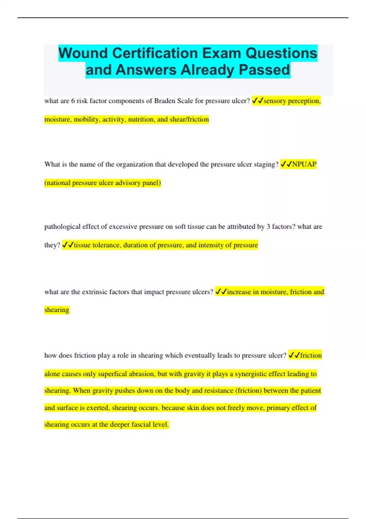 Wound Certification Exam Questions and Answers Already Passed what are 6 risk factor components of Braden Scale for pressure ulcer? sensory perception, moisture, mobility, activity, nutrition, and shear/friction What is the name of the organization that developed the pressure ulcer staging? NPUAP (national pressure ulcer advisory panel) pathological effect of excessive pressure on soft tissue can be attributed by 3 factors? what are they? tissue tolerance, duration of pressure, and intensity of pressure what are the extrinsic factors that impact pressure ulcers? increase in moisture, friction and shearing how does friction play a role in shearing which eventually leads to pressure ulcer? friction alone causes only superfical abrasion, but with gravity it plays a synergistic effect leading to shearing. When gravity pushes down on the body and resistance (friction) between the patient and surface is exerted, shearing occurs. because skin does not freely move, primary effect of shearing occurs at the deeper fascial level. what are the intrisinc factors of pressur ulcers? nutritional debilitation, advanced age, low BP, stress, smoking, elevated body temperature Aging skin undergoes what elements affecting risk for pressure ulcer? dermoepidermal junction flattens, less nutrient exchange occurs, less resistance to shearing, changes in sensory perception, loss of dermal thickness, increased vascular fragility; ability of soft tisuse to distribute mechanical load w/out comprosing blood flow is impaired What does nonblanching erythema indicate in the skin r/t PU? when pressure is applied to the erythematic area skin becomes white (blanched), but once relieved, erythema returns - indicating blood flow; however in nonblanching erythema, skin does not blanche-indicating impaired blood flow-suggesting tissue destructon why does sitting in a chair pose more of a risk in skin break down than lying? deep tissue injury or PU is likely to occur sooner sitting down because tissue offloading over boney prominences is higher Describe what you will see in deep tissue injury? purple or maroon localized area of discolored intact skin skinor blood filled blister; may be preceded by painful, firm, mushy, or boggy; skin may be warmer to cooler in adjacent tissue. In dark skin, thin blister or eschar over a dark wound bed may bee seen Describe stage I pressure ulcer? Intact