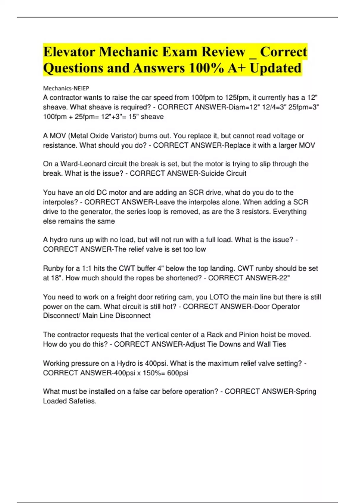 Elevator Mechanic Exam Review _ Correct Questions and Answers 100% A+ Updated