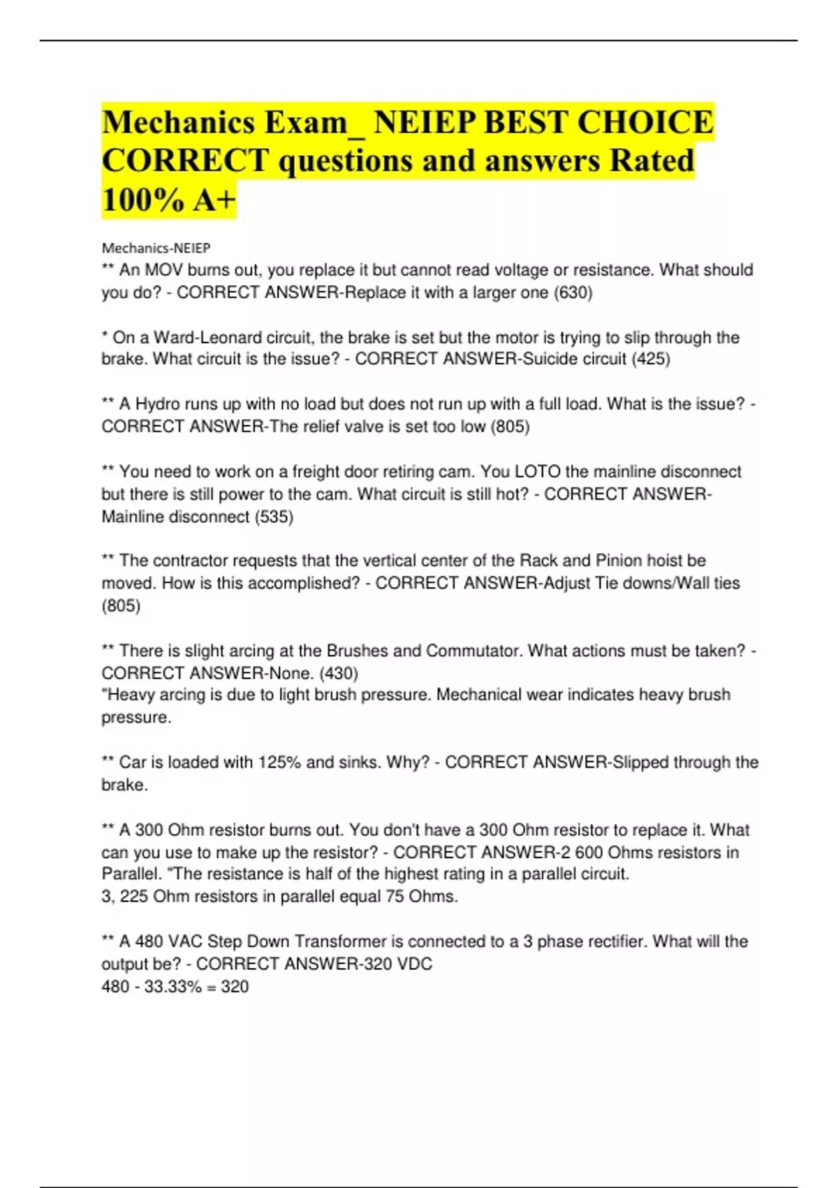 Mechanics Exam_ NEIEP BEST CHOICE CORRECT questions and answers Rated 100% A+ Mechanics-NEIEP ** An MOV burns out, you replace it but cannot read voltage or resistance. What should you do? - CORRECT ANSWER-Replace it with a larger one (630) * On a Ward-Leonard circuit, the brake is set but the motor is trying to slip through the brake. What circuit is the issue? - CORRECT ANSWER-Suicide circuit (425) ** A Hydro runs up with no load but does not run up with a full load. What is the issue? - CORRECT ANSWER-The relief valve is set too low (805) ** You need to work on a freight door retiring cam. You LOTO the mainline disconnect but there is still power to the cam. What circuit is still hot? - CORRECT ANSWER-Mainline disconnect (535) ** The contractor requests that the vertical center of the Rack and Pinion hoist be moved. How is this accomplished? - CORRECT ANSWER-Adjust Tie downs/Wall ties (805) ** There is slight arcing at the Brushes and Commutator. What actions must be taken? - CORRECT ANSWER-None. (430) "Heavy arcing is due to light brush pressure. Mechanical wear indicates heavy brush pressure. ** Car is loaded with 125% and sinks. Why? - CORRECT ANSWER-Slipped through the brake. ** A 300 Ohm resistor burns out. You don't have a 300 Ohm resistor to replace it. What can you use to make up the resistor? - CORRECT ANSWER-2 600 Ohms resistors in Parallel. "The resistance is half of the highest rating in a parallel circuit. 3, 225 Ohm resistors in parallel equal 75 Ohms. ** A 480 VAC Step Down Transformer is connected to a 3 phase rectifier. What will the output be? - CORRECT ANSWER-320 VDC 480 - 33.33% = 320