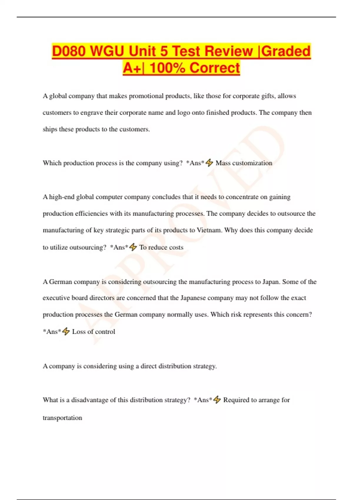 D080 WGU Unit 5 Test Review |Graded A+| 100% Correct A global company that makes promotional products, like those for corporate gifts, allows customers to engrave their corporate name and logo onto finished products. The company then ships these products to the customers. Which production process is the company using? *Ans* Mass customization A high-end global computer company concludes that it needs to concentrate on gaining production efficiencies with its manufacturing processes. The company decides to outsource the manufacturing of key strategic parts of its products to Vietnam. Why does this company decide to utilize outsourcing? *Ans* To reduce costs A German company is considering outsourcing the manufacturing process to Japan. Some of the executive board directors are concerned that the Japanese company may not follow the exact production processes the German company normally uses. Which risk represents this concern? *Ans* Loss of control A company is considering using a direct distribution strategy. What is a disadvantage of this distribution strategy? *Ans* Required to arrange for transportation Which distribution strategy has grown rapidly due to the increase in e-commerce? *Ans* Direct channel distribution Which source of funding uses technology platforms to invite consumers to invest small amounts in support of a business idea or venture? *Ans* Crowdsourcing A company in the United States has encountered a financial reporting situation that is not currently addressed by the accounting standards of the country. How should the U.S. company proceed? *Ans* Consult with the FASB Which type of risk refers to the impact of random change in the value of one currency with respect to other currencies? *Ans* Currency risk Which term defines using currency derivatives to reduce potential currency risks due to currency exchange rate movement that could lead to losses for a firm? *Ans* Hedging A company has achieved a monetary advantage by using a fronting loan with a subsidiary in a country with a low corporate income tax rate. Which type of tax situation in this country allows the company to achieve this monetary advanta