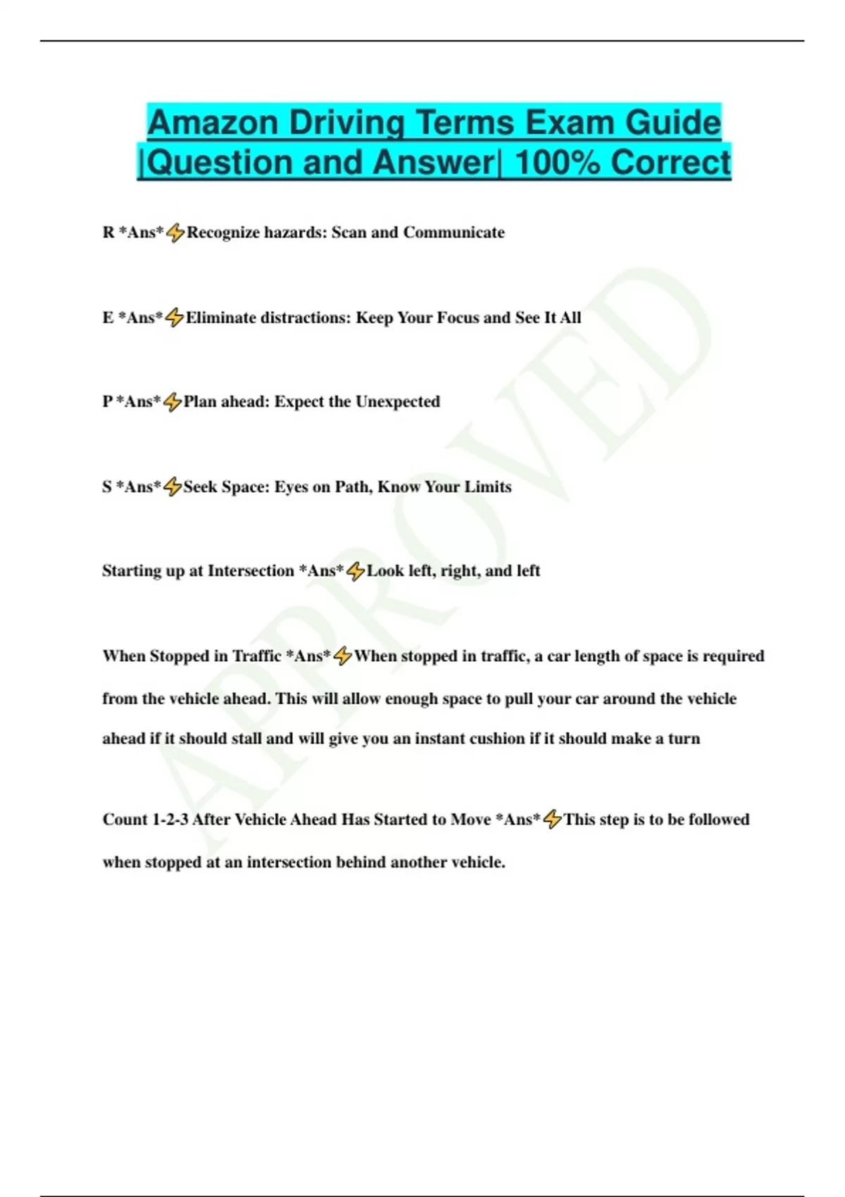 Amazon Driving Terms Exam Guide |Question and Answer| 100% Correct R *Ans* Recognize hazards: Scan and Communicate E *Ans* Eliminate distractions: Keep Your Focus and See It All P *Ans* Plan ahead: Expect the Unexpected S *Ans* Seek Space: Eyes on Path, Know Your Limits Starting up at Intersection *Ans* Look left, right, and left When Stopped in Traffic *Ans* When stopped in traffic, a car length of space is required from the vehicle ahead. This will allow enough space to pull your car around the vehicle ahead if it should stall and will give you an instant cushion if it should make a turn Count 1-2-3 After Vehicle Ahead Has Started to Move *Ans* This step is to be followed when stopped at an intersection behind another vehicle
