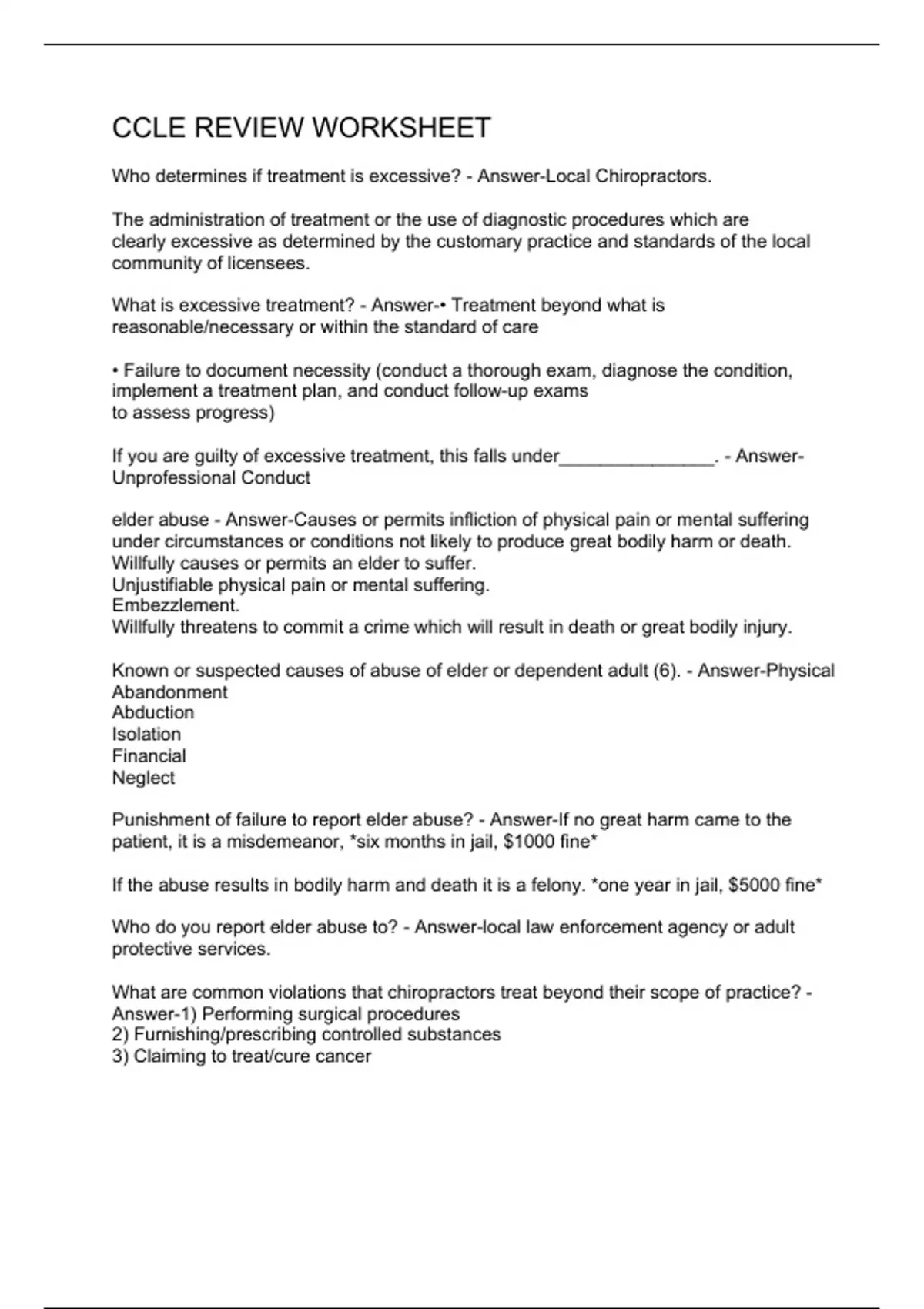 Who determines if treatment is excessive? - Answer-Local Chiropractors. The administration of treatment or the use of diagnostic procedures which are clearly excessive as determined by the customary practice and standards of the local community of licensees. What is excessive treatment? - Answer-• Treatment beyond what is reasonable/necessary or within the standard of care • Failure to document necessity (conduct a thorough exam, diagnose the condition, implement a treatment plan, and conduct follow-up exams to assess progress) If you are guilty of excessive treatment, this falls under_______________. - Answer-Unprofessional Conduct elder abuse - Answer-Causes or permits infliction of physical pain or mental suffering under circumstances or conditions not likely to produce great bodily harm or death. Willfully causes or permits an elder to suffer. Unjustifiable physical pain or mental suffering. Embezzlement. Willfully threatens to commit a crime which will result in death or great bodily injury. Known or suspected causes of abuse of elder or dependent adult (6). - Answer-Physical Abandonment Abduction Isolation Financial Neglect Punishment of failure to report elder abuse? - Answer-If no great harm came to the patient, it is a misdemeanor, *six months in jail, $1000 fine* If the abuse results in bodily harm and death it is a felony. *one year in jail, $5000 fine* W