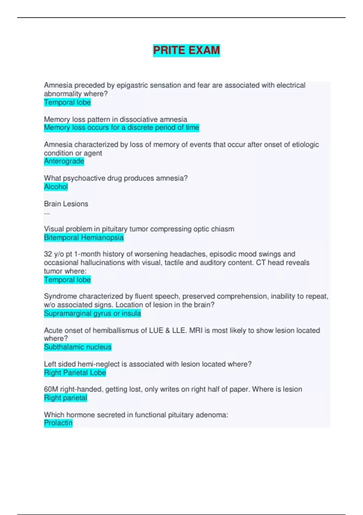 PRITE EXAM (2024/2025) - Questions and Answers (Complete Solutions) Amnesia preceded by epigastric sensation and fear are associated with electrical abnormality where? Temporal lobe Memory loss pattern in dissociative amnesia Memory loss occurs for a discrete period of time Amnesia characterized by loss of memory of events that occur after onset of etiologic condition or agent Anterograde What psychoactive drug produces amnesia? Alcohol Brain Lesions ... Visual problem in pituitary tumor compressing optic chiasm Bitemporal Hemianopsia 32 y/o pt 1-month history of worsening headaches, episodic mood swings and occasional hallucinations with visual, tactile and auditory content. CT head reveals tumor where: Temporal lobe Syndrome characterized by fluent speech, preserved comprehension, inability to repeat, w/o associated signs. Location of lesion in the brain? Supramarginal gyrus or insula Acute onset of hemiballismus of LUE & LLE. MRI is most likely to show lesion located where? Subthalamic nucleus Left sided hemi-neglect is associated with lesion located where? Right Parietal Lobe 60M right-handed, getting lost, only writes on right half of paper. Where is lesion Right parietal Which hormone secreted in functional pituitary adenoma: Prolactin CT & MRI show ventriculomegaly are out of proportion to sulcal atrophy. This is suggestive of what diagnosis? Normal Pressure Hydrocephalus 5 y/o with 4 month history of morning HA, vomiting, and recent problems with gait, falls, and diplopia Medulloblastoma 20 y/o with 1 yr of bitemporal headaches, polydipsia, polyuria, bulimia. For 2 months emotional outburst aggressive and transient confusion neuro exam normal. What will MRI of brain show? Hypothalamic tumor Previously pleasant mom becomes profane and irresponsible over 6 months: Frontal lobe Unilateral hearing loss with vertigo, unsteadiness with falls and headaches, mild facial weakness and ipsilateral limb ataxia is most commonly associated with tumors in what locations: Cerebellopontine angle Catatonia ... 52 y/o with h/o unipolar depression is brought to ED with a first episode of catatonia. Patient is on no meds, UDS is neg. Further w/u should initially focus on what factor? Metabolic disorders Which term describes state of immobility that is constantly maintained? Cataplexy Ability of catatonic pt to hold same position Catalepsy CVA ... Chronic Afib develops aphasia and R hemiparesis at noon. ER exam notes weakness of R extremities and severe dysfluent aphasia, but CT at 1:30 PM has no acute lesion. Most appropriate treatment: TPA Young adult gained 70 lbs in last year c/o daily severe headaches sometimes assoc with graying out of vision. Papilledema present. CT and MRI brain no abnormalities but ventricles smaller than usual. Goal of treatment in this case: Prevent blindness Patient with hypertension develops vertigo, nausea, vomiting, hiccups, left sided face numbness, nystagmus, hoarseness, ataxia of the limbs, staggering gait, and is falling to the left. Dx? Lateral medullary stroke Rapid onset of right facial weakness, left limb weakness, diplopia Brain Stem Infarction Transient symptom associated with carotid stenosis: Monocular blindness 62 y/o M w DM is not making sense, saying "thar szing is phrumper zu stalking". Normal intonation but no one in the family can understand it. He verbally responds to questions with similar utterances but fails to successfully execute any instruction. Wernicke's aphasia 58 y/o M h/o HTN, cig smoking and sudden inability to speak. Face drooping on R and dragging R leg. In ER examined within 40 mins of onset: Aphasic, unable to understand or repeat verbal commands. Unintelligable sounds for speech. Alert but appeared frustrated. R hemiplegia with arm and face weaker than leg. CT head showed no hemorrhage. Pathology type and area: Thromboembolic stroke L MCA (middle cerebral artery) Abulia refers to impairment in ability to: Spontaneously move and speak Sudden-onset left hemiparesis with deviation of eyes to the right Right putaminal hemorrhage Sudden onset vertigo/nausea, hoarseness/dysphagia, right sided face numbness, diminished gag reflex on right, decreased pinprick and temp sensation on left Right medullary infarction 65 y/o diabetic presents to ED c/o acute L sided weakness, deviation of gaze to R, L hemiplegia and hemisensory deficit, and L homonymous hemianopsia. 12 hrs later, pt is unconscious, L pupil enlarged and unreactive. CT will show what? R MCA infarct w/ edema and uncal herniation Pt with acute onset vertigo, what will suggest R lateral medullary infarct? R facial loss of touch + temp sensation 46 y/o M w/ double vision + pain R eye. Exam: ptosis R eyelid, inability to elevate or adduct R eye + R pupillary dilation. This is caused by: Post. Communicating artery aneurysm Aphasia w/ effortful fragmented, dysfluent, telegraphic speech, is seen in a lesion where? Post frontal lobe 39 year old with h/o of multiple miscarriages develops an acute left sided hemiparesis. Work up revels elevated anticardiolipin titers and no other risk factors for stroke. Appropriate intervention at this point is? Plasmapheresis Abnormal elevated metabolic findings associated with increased risk of stroke in patients under 50 Plasma homocysteine 73 y/o found on floor, unaware of L UE/LE. Flaccid L arm, but denies anything wrong and when asked to raise L arm raises R. When asked which arm is her L, she replies "yours." Dx? Parietal lobe CVA CT scan with occipital and intraventricular hyperintensities Parenchymal hemorrhage Which med has secondary prevention against embolic stroke in patients with Afib? Oral warfarin As opposed to strokes caused by arterial embolism or thrombosis, those caused by cerebral vein or venous sinus thrombosis are More often associated with seizures at onset Atrophy of right temporal lobe on cross section associated with occlusion of: Middle cerebral artery Loss of ability to execute previously learned motor activities (which is not the 