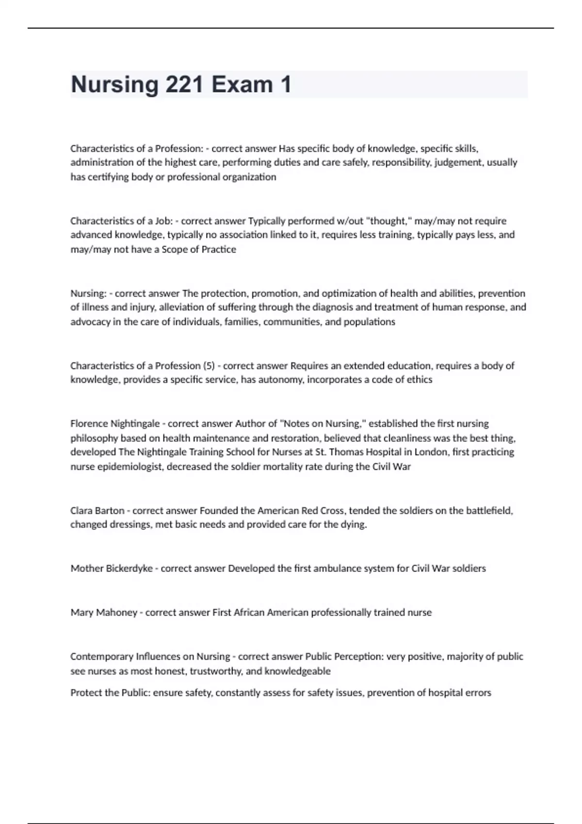 Nursing 221 Exam 1Characteristics of a Profession: - correct answer Has specific body of knowledge, specific skills, administration of the highest care, performing duties and care safely, responsibility, judgement, usually has certifying body or professional organization Characteristics of a Job: - correct answer Typically performed w/out "thought," may/may not require advanced knowledge, typically no association linked to it, requires less training, typically pays less, and may/may not have a Scope of Practice Nursing: - correct answer The protection, promotion, and optimization of health and abilities, prevention of illness and injury, alleviation of suffering through the diagnosis and treatment of human response, and advocacy in the care of individuals, families, communities, and populations Characteristics of a Profession (5) - correct answer Requires an extended education, requires a body of knowledge, provides a specific service, has autonomy, incorporates a code of ethics Florence Nightingale - correct answer Author of "Notes on Nursing," established the first nursing philosophy based on health maintenance and restoration, believed that cleanliness was the best thing, developed The Nightingale Training School for Nurses at St. Thomas Hospital in London, first practicing nurse epidemiologist, decreased the soldier mortality rate during the Civil War Clara Barton - correct answer Founded the American Red Cross, tended the soldiers on the battlefield, changed dressings, met basic needs and provided care for the dying. Mother Bickerdyke - correct answer Developed the first ambulance system for Civil War soldiers Mary Mahoney - correct answer First African American professionally trained nurse