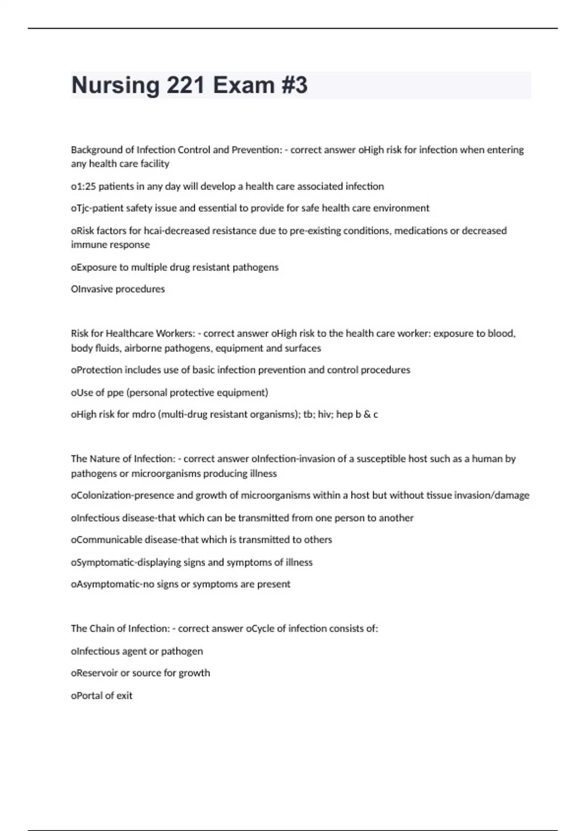 Nursing 221 Exam #3Background of Infection Control and Prevention: - correct answer oHigh risk for infection when entering any health care facility o1:25 patients in any day will develop a health care associated infection oTjc-patient safety issue and essential to provide for safe health care environment oRisk factors for hcai-decreased resistance due to pre-existing conditions, medications or decreased immune response oExposure to multiple drug resistant pathogens OInvasive procedures Risk for Healthcare Workers: - correct answer oHigh risk to the health care worker: exposure to blood, body fluids, airborne pathogens, equipment and surfaces oProtection includes use of basic infection prevention and control procedures oUse of ppe (personal protective equipment) oHigh risk for mdro (multi-drug resistant organisms); tb; hiv; hep b & c The Nature of Infection: - correct answer oInfection-invasion of a susceptible host such as a human by pathogens or microorganisms producing illness oColonization-presence and growth of microorganisms within a host but without tissue invasion/damage oInfectious disease-that which can be transmitted from one person to another oCommunicable disease-that which is transmitted to others oSymptomatic-displaying signs and symptoms of illness oAsymptomatic-no signs or symptoms are present The Chain of Infection: - correct answer oCycle of infection consists of: oInfectious agent or pathogen oReservoir or source for growth oPortal of exit oMethod of transmission oPort of entry to host oSusceptible host oChain must be intact for infection to spread Infectious Agent: - correct answer -Bacteria, Viruses, Fungi, Protozoa