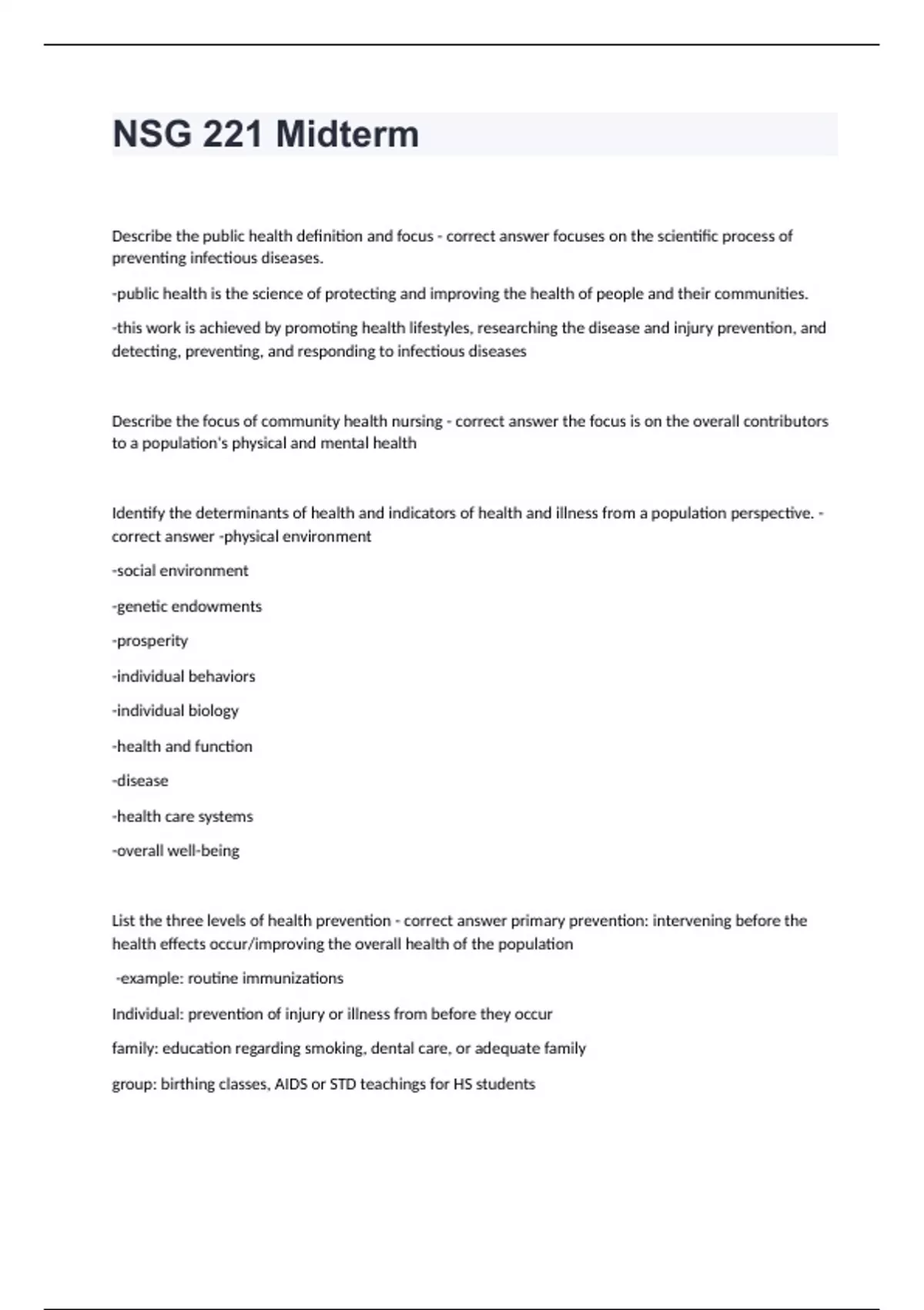 NSG 221 Midterm Describe the public health definition and focus - correct answer focuses on the scientific process of preventing infectious diseases. -public health is the science of protecting and improving the health of people and their communities. -this work is achieved by promoting health lifestyles, researching the disease and injury prevention, and detecting, preventing, and responding to infectious diseases Describe the focus of community health nursing - correct answer the focus is on the overall contributors to a population's physical and mental health Identify the determinants of health and indicators of health and illness from a population perspective. - correct answer -physical environment -social environment -genetic endowments -prosperity -individual behaviors -individual biology -health and function -disease -health care systems -overall well-being List the three levels of health prevention - correct answer primary prevention: intervening before the health effects occur/improving the overall health of the population -example: routine immunizations Individual: prevention of injury or illness from before they occur family: education regarding smoking, dental care, or adequate family group: birthing classes, AIDS or STD teachings for HS students