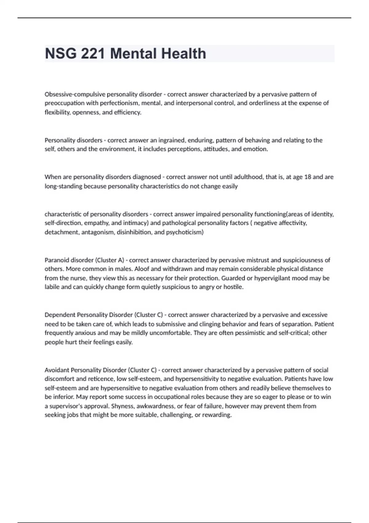 NSG 221 Mental HealthObsessive-compulsive personality disorder - correct answer characterized by a pervasive pattern of preoccupation with perfectionism, mental, and interpersonal control, and orderliness at the expense of flexibility, openness, and efficiency. Personality disorders - correct answer an ingrained, enduring, pattern of behaving and relating to the self, others and the environment, it includes perceptions, attitudes, and emotion. When are personality disorders diagnosed - correct answer not until adulthood, that is, at age 18 and are long-standing because personality characteristics do not change easily characteristic of personality disorders - correct answer impaired personality functioning(areas of identity, self-direction, empathy, and intimacy) and pathological personality factors ( negative affectivity, detachment, antagonism, disinhibition, and psychoticism) Paranoid disorder (Cluster A) - correct answer characterized by pervasive mistrust and suspiciousness of others. More common in males. Aloof and withdrawn and may remain considerable physical distance from the nurse, they view this as necessary for their protection. Guarded or hypervigilant mood may be labile and can quickly change form quietly suspicious to angry or hostile. Dependent Personality Disorder (Cluster C) - correct answer characterized by a pervasive and excessive need to be taken care of, which leads to submissive and clinging behavior and fears of separation. Patient frequently anxious and may be mildly uncomfortable. They are often pessimistic and self-critical; other people hurt their feelings easily. Avoidant Personality Disorder (Cluster C) - correct answer characterized by a pervasive pattern of social discomfort and reticence, low self-esteem, and hypersensitivity to negative evaluation. Patients have low self-esteem and are hypersensitive to negative evaluation from others and readily believe themselves to be inferior. May report some success in occupational roles because they are so eager to please or to win a supervisor's approval. Shyness, awkwardness, or fear of failure, however may prevent them from seeking jobs that might be more suitable, challenging, or rewarding.