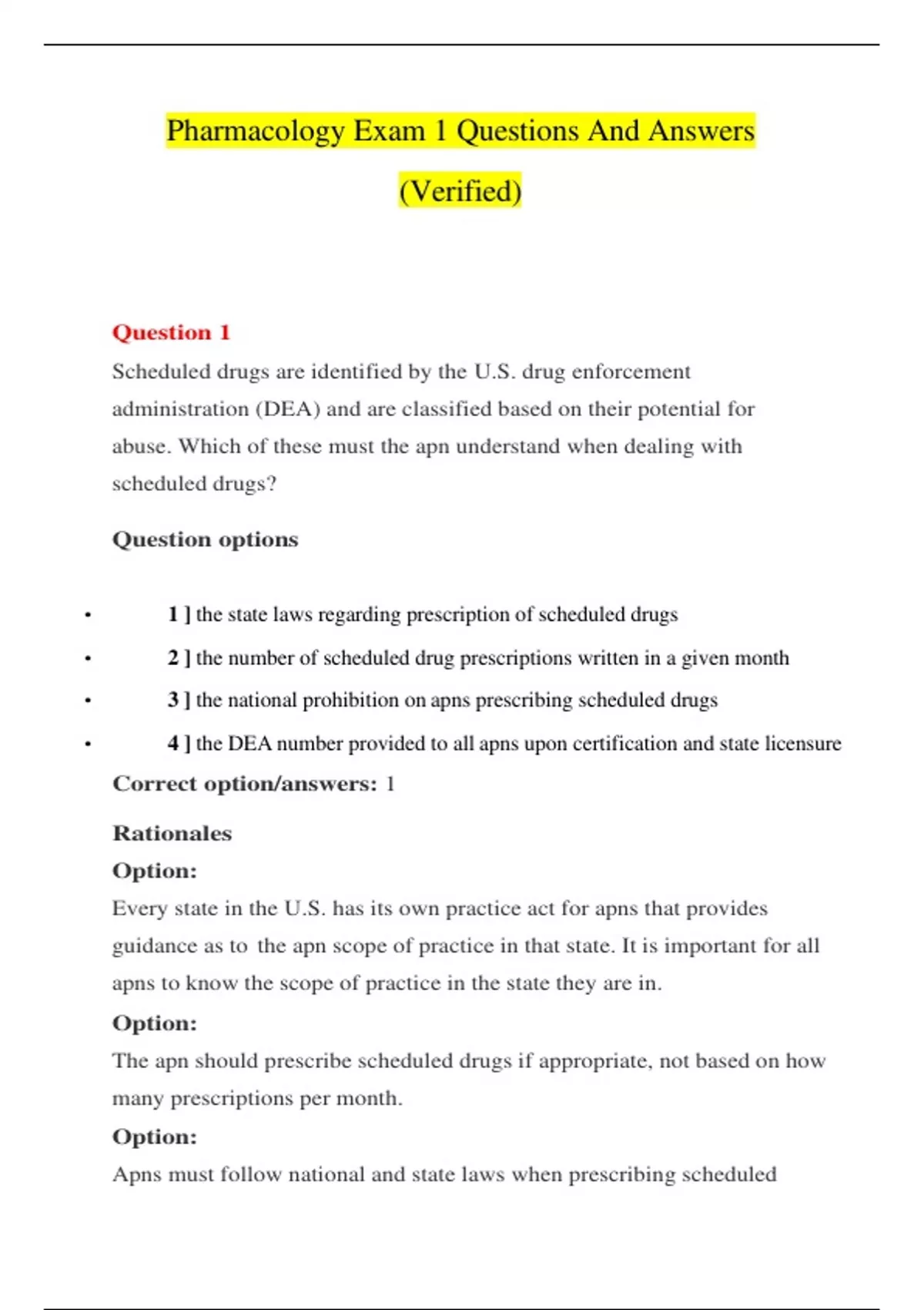 Pharmacology Exam 1 Questions And Answers (Verified) Question 1 Scheduled drugs are identified by the U.S. drug enforcement administration (DEA) and are classified based on their potential for abuse. Which of these must the apn understand when dealing with scheduled drugs? Question options • 1 ] the state laws regarding prescription of scheduled drugs • 2 ] the number of scheduled drug prescriptions written in a given month • 3 ] the national prohibition on apns prescribing scheduled drugs • 4 ] the DEA number provided to all apns upon certification and state licensure Correct option/answers: 1 Rationales Option: Every state in the U.S. has its own practice act for apns that provides guidance as to the apn scope of practice in that state. It is important for all apns to know the scope of practice in the state they are in. Option: The apn should prescribe scheduled drugs if appropriate, not based on how many prescriptions per month. Option: Apns must follow national and state laws when prescribing scheduled drugs, but in many states they are able to do so. Option: Not all apns are given DEA numbers. In states where apns can obtain a DEA number for prescribing scheduled drugs, it is a separate procedure completed with the DEA. [page reference: 47] Question 2 Which statement about drug absorption through the stomach is true? Question options • 1 ] nutrients can induce metabolic processes but not inhibit these processes, and therefore rarely affect the bioavailability of a drug. • 2 ] changes in ph. from antacids can reduce absorption of folic acid, iron, and vitamin b12, which can cause different types of metabolic symptoms and diseases. • 3 ] foods and nutrients cannot create adverse reactions to a drug. This can only happen with drug interactions and allergies to the drug. • 4 ] vitamins are not nutrients and therefore are not considered when discussing nutrient intake. Correct option/answers: 2 Rationales Option: Nutrients can both induce and inhibit metabolic processes and therefore they do affect the bioavailability of a drug. Option: When the stomach becomes less acidic due to foods or antacids, the absorption of folic acid, iron, and vitamin b12 can be reduced. Option: Nutrients can increase the risk for or cause adverse drug reactions, and the apn should question the patient experiencing the about foods they are eating. Option: Vitamins are nutrients, and the vitamins patients take should be reviewed when investigating a drug reaction. [page reference: 81] Question 3 The patient is prescribed a drug that has a high acid content. Where will this drug most easily be absorbed through passive diffusion? Question options • 1 ] in the acid environment of the stomach • 2 ] in the basic environment of the small intestine • 3 ] throughout the gastrointestinal (gi) tract, because acid–base issues are not important • 4 ] only after there has been an adjustment based on acid content of the liver Correct option/answers: 2 Rationales Option: There has to be a difference in acid–base concentration on both sides of the cell membrane for passive diffusion to occur. With an acid-based drug in the acid environment of the stomach, the drug cannot pass through the cell membrane using passive diffusion. Option: This is the correct answer because the acid-based drug and the base environment of the intestine will balance each other and allow for passive diffusion. Option: Acid and base environments are important for passive diffusion. Option: The liver does not adjust the acid content of a drug. [page reference: 26]