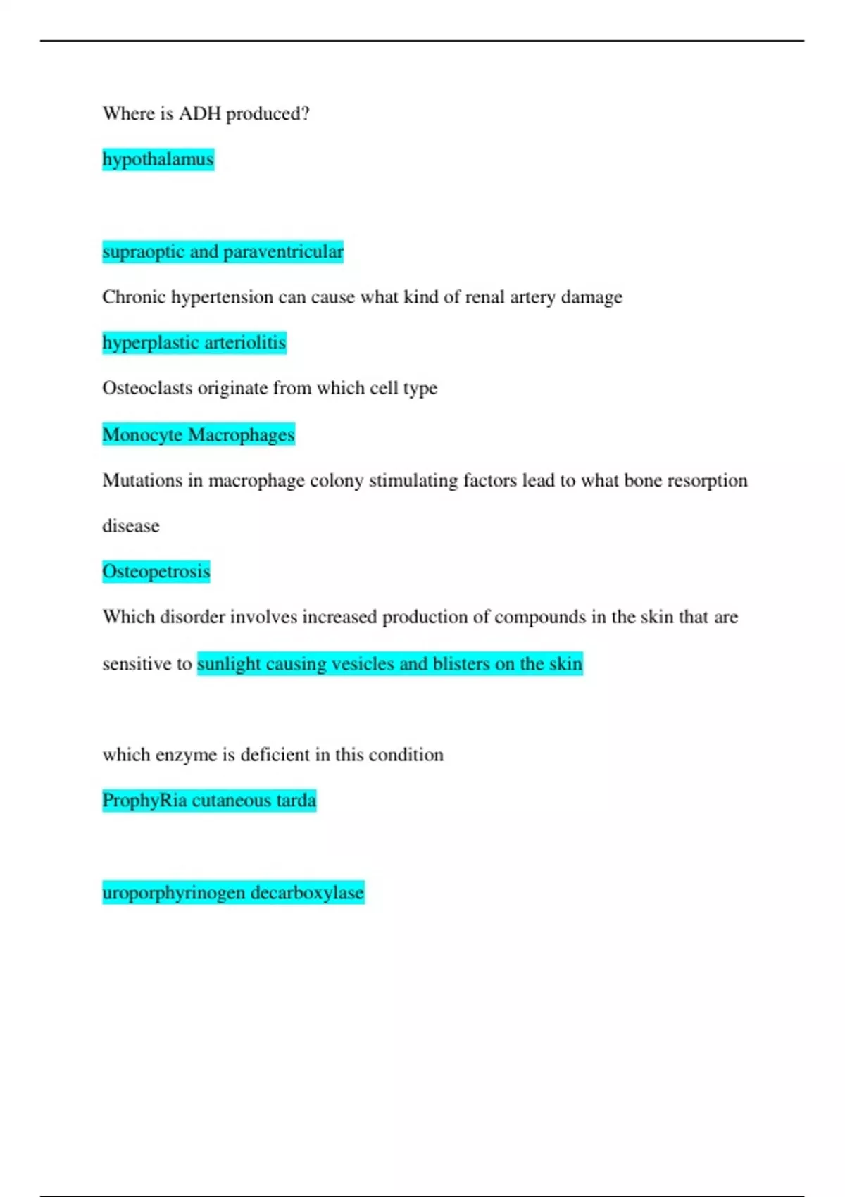 NBME 30 Questions and Answers, 100% Correct Where is ADH produced? hypothalamus supraoptic and paraventricular Chronic hypertension can cause what kind of renal artery damage hyperplastic arteriolitis Osteoclasts originate from which cell type Monocyte Macrophages Mutations in macrophage colony stimulating factors lead to what bone resorption disease Osteopetrosis Which disorder involves increased production of compounds in the skin that are sensitive to sunlight causing vesicles and blisters on the skin which enzyme is deficient in this condition ProphyRia cutaneous tarda uroporphyrinogen decarboxylase Which gonadotropic releasing hormone analog initially released causes and increase in fsh and LH then later acts as an antagonist reducing the FSH and LH amount. Leuprolide/ goserelin When does the placenta become responsible for the production of progesterone