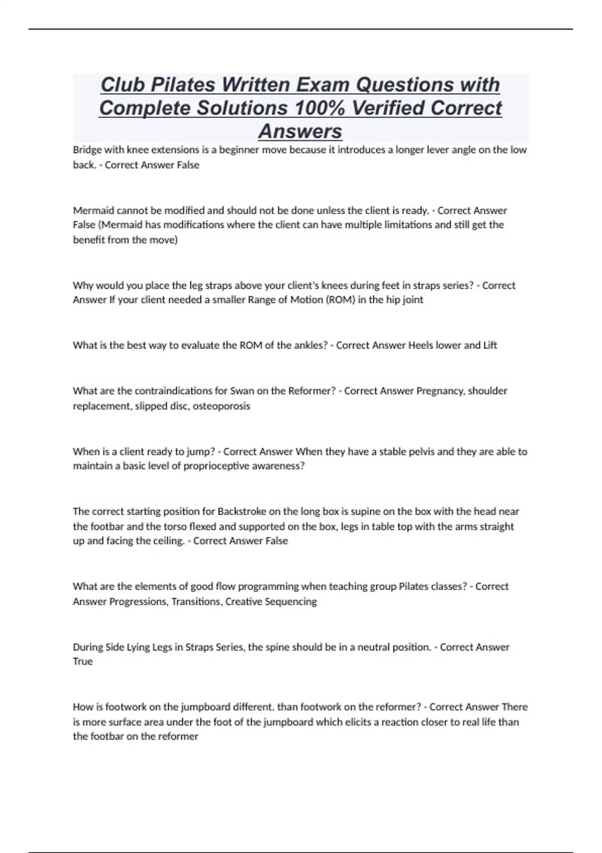 Club Pilates Written Exam Questions with Complete Solutions 100% Verified Correct Answers Bridge with knee extensions is a beginner move because it introduces a longer lever angle on the low back. - Correct Answer False Mermaid cannot be modified and should not be done unless the client is ready. - Correct Answer False (Mermaid has modifications where the client can have multiple limitations and still get the benefit from the move) Why would you place the leg straps above your client's knees during feet in straps series? - Correct Answer If your client needed a smaller Range of Motion (ROM) in the hip joint What is the best way to evaluate the ROM of the ankles? - Correct Answer Heels lower and Lift What are the contraindications for Swan on the Reformer? - Correct Answer Pregnancy, shoulder replacement, slipped disc, osteoporosis When is a client ready to jump? - Correct Answer When they have a stable pelvis and they are able to maintain a basic level of proprioceptive awareness? The correct starting position for Backstroke on the long box is supine on the box with the head near the footbar and the torso flexed and supported on the box, legs in table top with the arms straight up and facing the ceiling. - Correct Answer False What are the elements of good flow programming when teaching group Pilates classes? - Correct Answer Progressions, Transitions, Creative Sequencing During Side Lying Legs in Straps Series, the spine should be in a neutral position. - Correct Answer True How is footwork on the jumpboard different. than footwork on the reformer? - Correct Answer There is more surface area under the foot of the jumpboard which elicits a reaction closer to real life than the footbar on the reformer What is the safest way to complete the arm facing side series? - Correct Answer Having the client sit on the carriage or long box What are the major muscles emphasized in supine arms in straps series? - Correct Answer Transverse abdominis for stabilization, hip flexors to hold legs in place and latissimus dorsi & the long head of the tricep for arm movement What is the most advanced variation of Bridge and why? - Correct Answer Semi circle - it incorporates multiple variations of spinal articulations and requires a client to have impeccable proprioceptive awareness What are the four main muscles emphasized during footwork on the reformer? - Correct Answer Transverse Abdominis, Contralateral Obliques, Glutes, Hamstrings Clients should always be in thoracic extension when jumping supine on the jumpboard? - Correct Answer False Pick the correct list of possible matwork variations that could be taught on the reformer with arms in straps. - Correct Answer Single leg stretch, Double leg stretch, Lower and lift, Scissors, Helicopters, Criss-