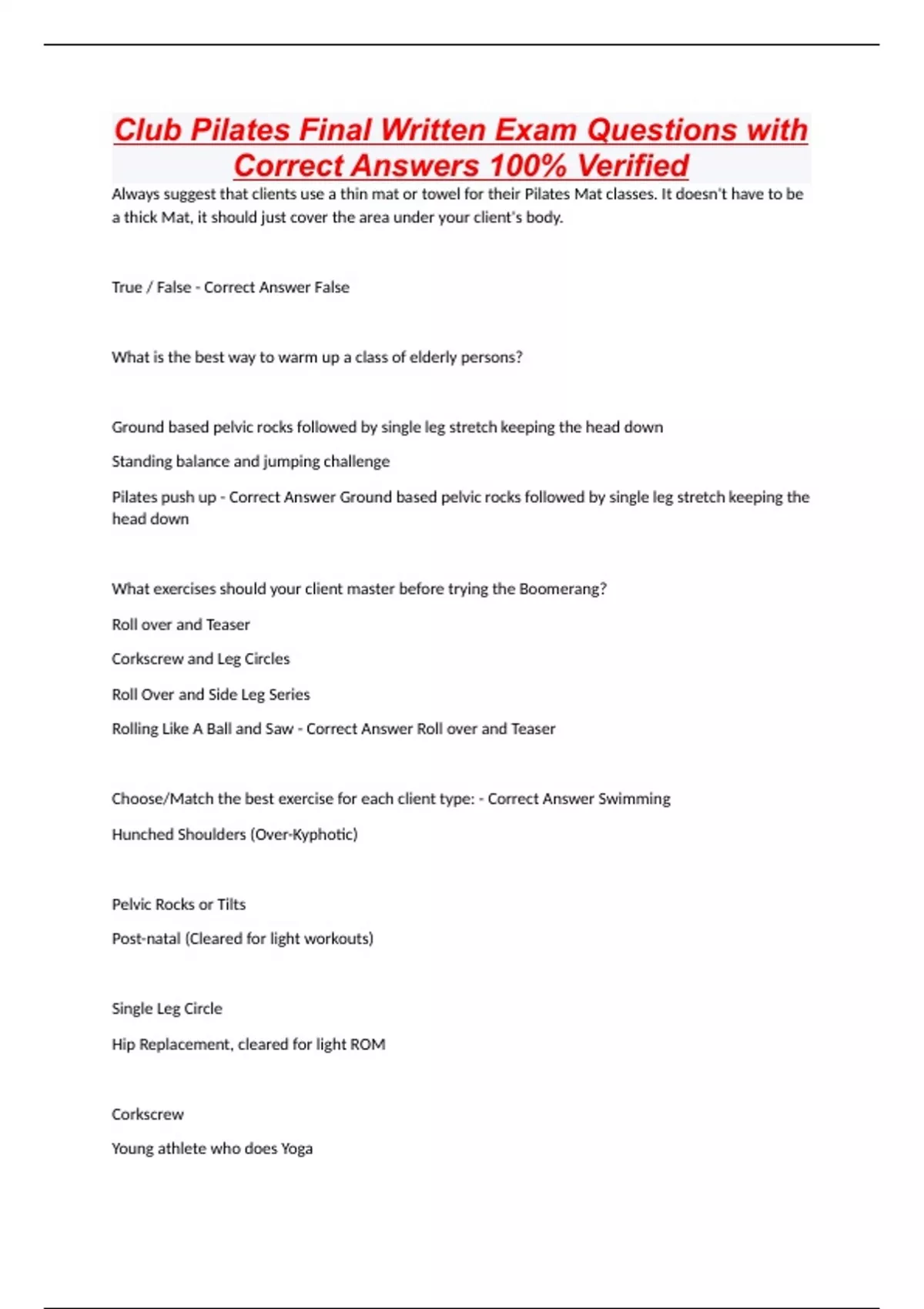 Club Pilates Final Written Exam Questions with Correct Answers 100% Verified Always suggest that clients use a thin mat or towel for their Pilates Mat classes. It doesn't have to be a thick Mat, it should just cover the area under your client's body. True / False - Correct Answer False What is the best way to warm up a class of elderly persons? Ground based pelvic rocks followed by single leg stretch keeping the head down Standing balance and jumping challenge Pilates push up - Correct Answer Ground based pelvic rocks followed by single leg stretch keeping the head down What exercises should your client master before trying the Boomerang? Roll over and Teaser Corkscrew and Leg Circles Roll Over and Side Leg Series Rolling Like A Ball and Saw - Correct Answer Roll over and Teaser Choose/Match the best exercise for each client type: - Correct Answer Swimming Hunched Shoulders (Over-Kyphotic) Pelvic Rocks or Tilts Post-natal (Cleared for light workouts) Single Leg Circle Hip Replacement, cleared for light ROM Corkscrew Young athlete who does Yoga After warming up my small group mat class, I plan on having them do ________________________ to get the back of their body warm and then _________________________ to get the front of their body warm. Knee Circles and Seal Corkscrew and S