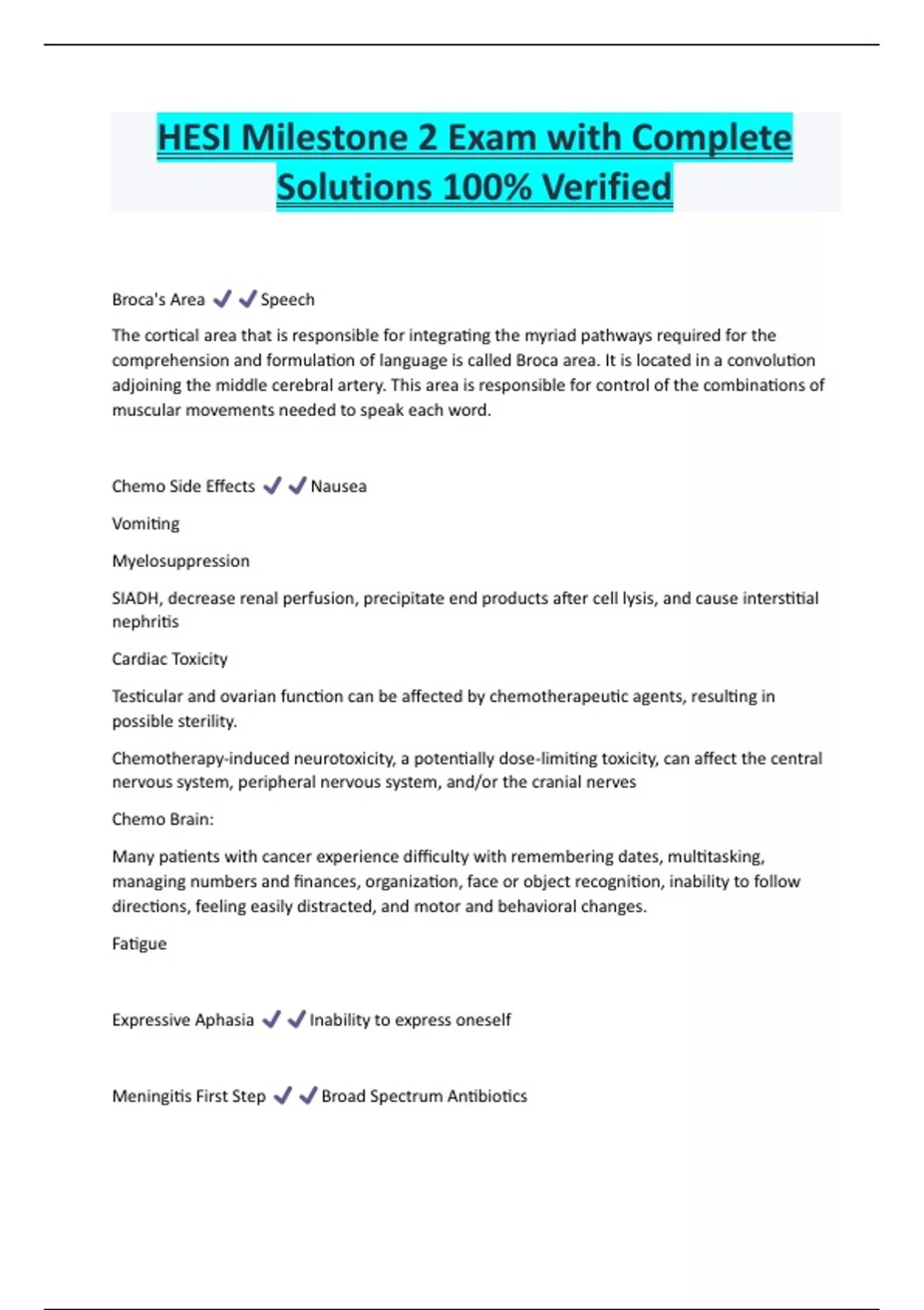 HESI Milestone 2 Exam with Complete Solutions 100% Verified Broca's Area Speech The cortical area that is responsible for integrating the myriad pathways required for the comprehension and formulation of language is called Broca area. It is located in a convolution adjoining the middle cerebral artery. This area is responsible for control of the combinations of muscular movements needed to speak each word. Chemo Side Effects Nausea Vomiting Myelosuppression SIADH, decrease renal perfusion, precipitate end products after cell lysis, and cause interstitial nephritis Cardiac Toxicity Testicular and ovarian function can be affected by chemotherapeutic agents, resulting in possible sterility. Chemotherapy-induced neurotoxicity, a potentially dose-limiting toxicity, can affect the central nervous system, peripheral nervous system, and/or the cranial nerves Chemo Brain: Many patients with cancer experience difficulty with remembering dates, multitasking, managing numbers and finances, organization, face or object recognition, inability to follow directions, feeling easily distracted, and motor and behavioral changes