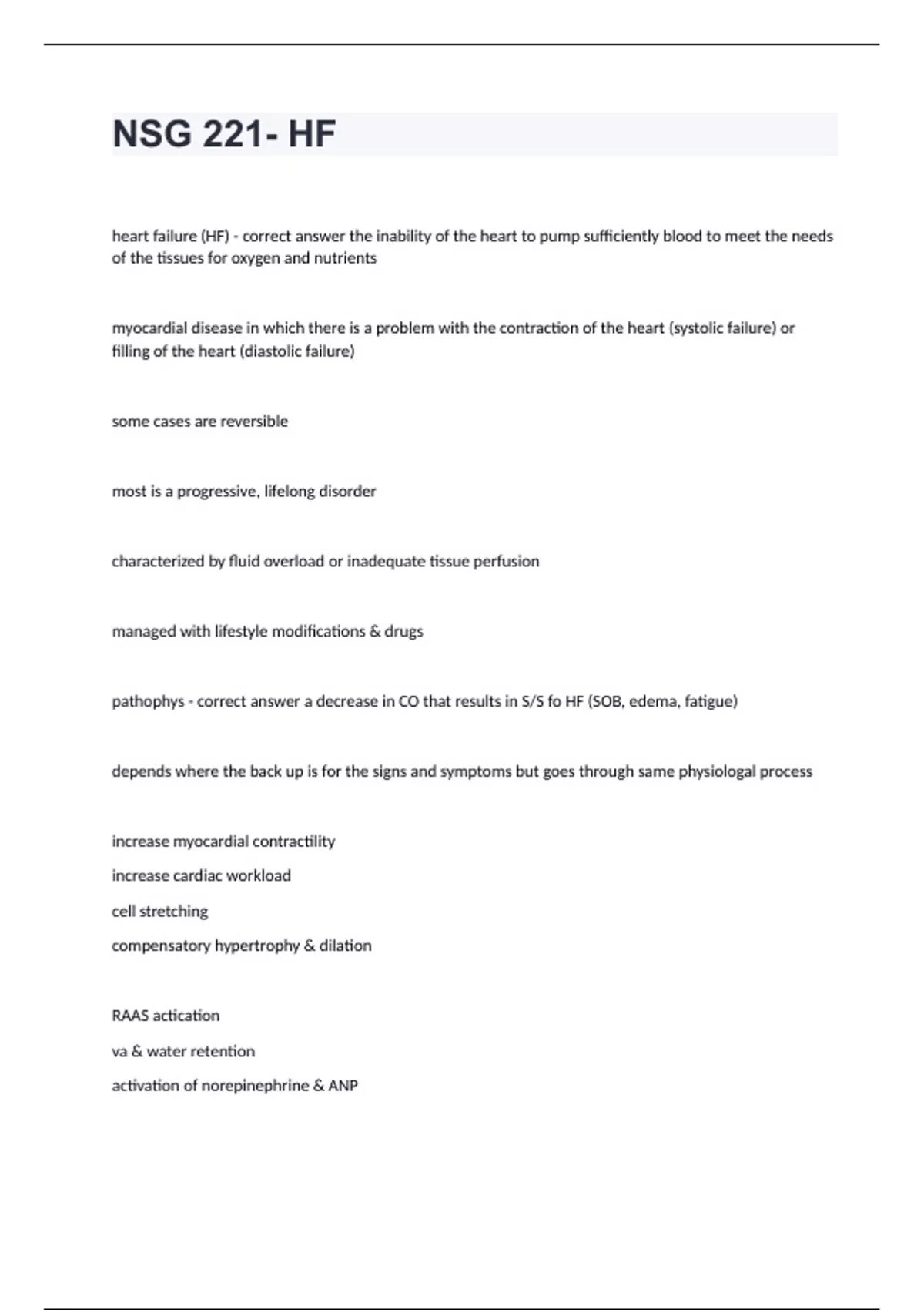 NSG 221- HF heart failure (HF) - correct answer the inability of the heart to pump sufficiently blood to meet the needs of the tissues for oxygen and nutrients myocardial disease in which there is a problem with the contraction of the heart (systolic failure) or filling of the heart (diastolic failure) some cases are reversible most is a progressive, lifelong disorder characterized by fluid overload or inadequate tissue perfusion managed with lifestyle modifications & drugs pathophys - correct answer a decrease in CO that results in S/S fo HF (SOB, edema, fatigue) depends where the back up is for the signs and symptoms but goes through same physiologal process increase myocardial contractility increase cardiac workload cell stretching compensatory hypertrophy & dilation RAAS actication va & water retention activation of norepinephrine & ANP tachycardia