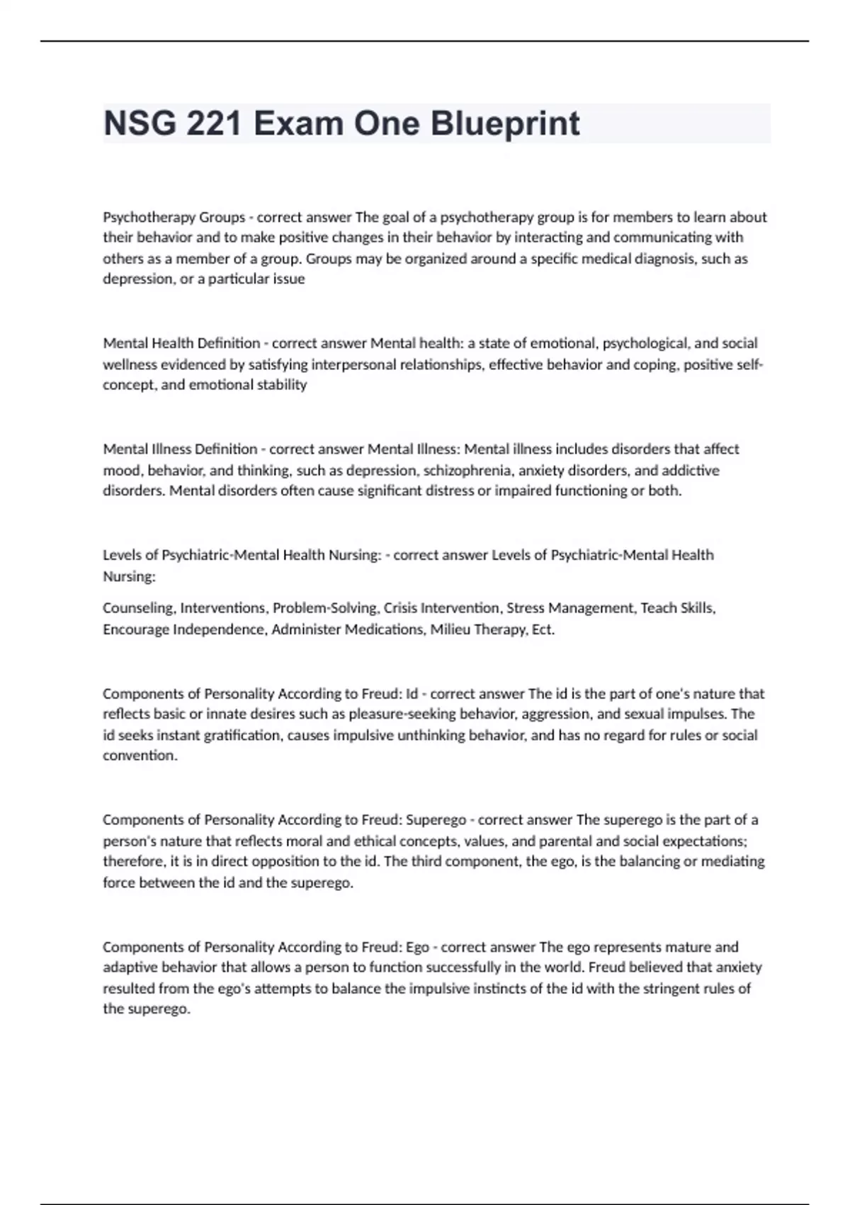 NSG 221 Exam One BlueprintPsychotherapy Groups - correct answer The goal of a psychotherapy group is for members to learn about their behavior and to make positive changes in their behavior by interacting and communicating with others as a member of a group. Groups may be organized around a specific medical diagnosis, such as depression, or a particular issue Mental Health Definition - correct answer Mental health: a state of emotional, psychological, and social wellness evidenced by satisfying interpersonal relationships, effective behavior and coping, positive self-concept, and emotional stability Mental Illness Definition - correct answer Mental Illness: Mental illness includes disorders that affect mood, behavior, and thinking, such as depression, schizophrenia, anxiety disorders, and addictive disorders. Mental disorders often cause significant distress or impaired functioning or both. Levels of Psychiatric-Mental Health Nursing: - correct answer Levels of Psychiatric-Mental Health Nursing: Counseling, Interventions, Problem-Solving, Crisis Intervention, Stress Management, Teach Skills, Encourage Independence, Administer Medications, Milieu Therapy, Ect. Components of Personality According to Freud: Id - correct answer The id is the part of one's nature that reflects basic or innate desires such as pleasure-seeking behavior, aggression, and sexual impulses. The id seeks instant gratification, causes impulsive unthinking behavior, and has no regard for rules or social convention. Components of Personality According to Freud: Superego - correct answer The superego is the part of a person's nature that reflects moral and ethical concepts, values, and parental and social expectations; therefore, it is in direct opposition to the id. The third component, the ego, is the balancing or mediating force between the id and the superego. Components of Personality According to Freud: Ego - correct answer The ego represents mature and adaptive behavior that allows a person to function successfully in the world. Freud believed that anxiety resulted from the ego's attempts to balance the impulsive instincts of the id with the stringent rules of the superego.