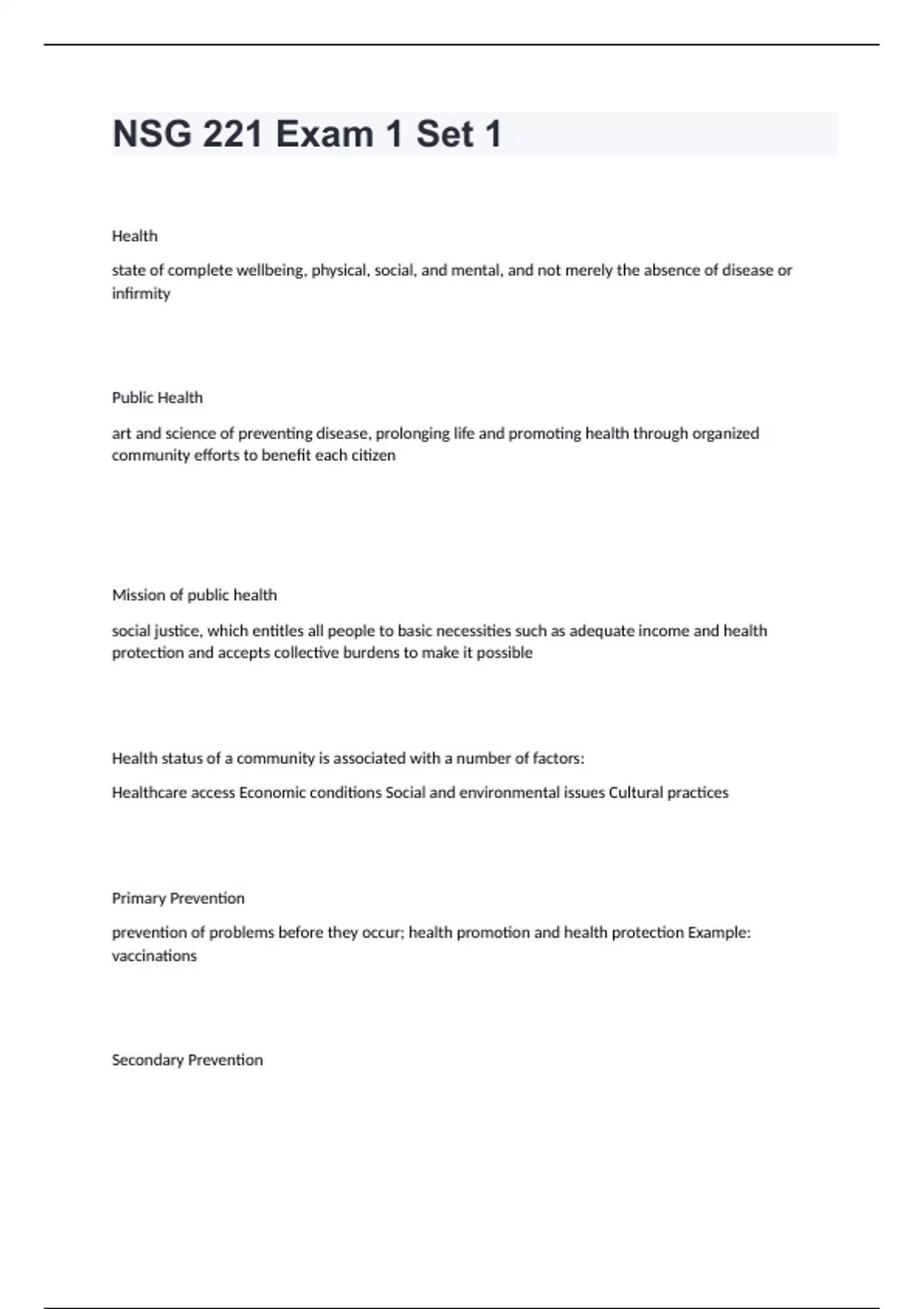 NSG 221 Exam 1 Set 1Health state of complete wellbeing, physical, social, and mental, and not merely the absence of disease or infirmity Public Health art and science of preventing disease, prolonging life and promoting health through organized community efforts to benefit each citizen Mission of public health social justice, which entitles all people to basic necessities such as adequate income and health protection and accepts collective burdens to make it possible Health status of a community is associated with a number of factors: Healthcare access Economic conditions Social and environmental issues Cultural practices Primary Prevention prevention of problems before they occur; health promotion and health protection Example: vaccinations Secondary Prevention