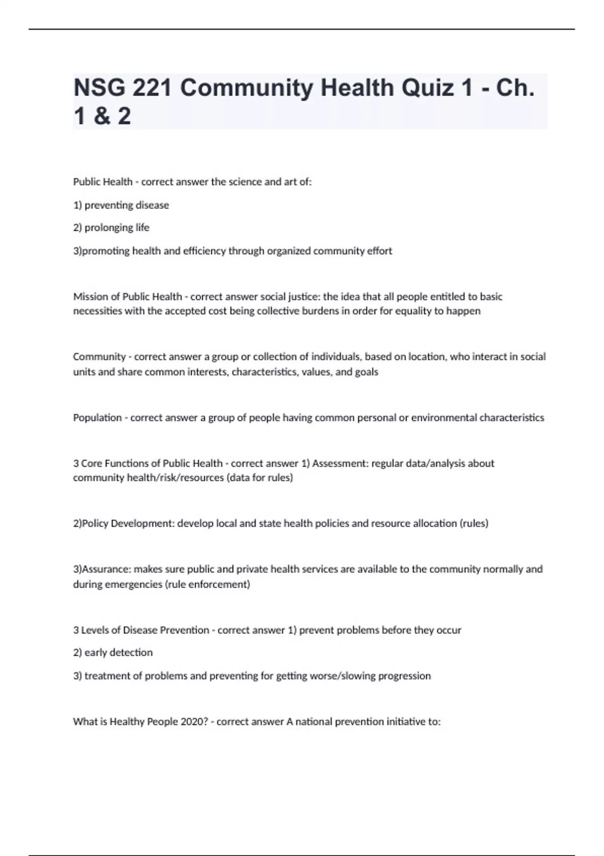 NSG 221 Community Health Quiz 1 - Ch. 1 & 2Public Health - correct answer the science and art of: 1) preventing disease 2) prolonging life 3)promoting health and efficiency through organized community effort Mission of Public Health - correct answer social justice: the idea that all people entitled to basic necessities with the accepted cost being collective burdens in order for equality to happen Community - correct answer a group or collection of individuals, based on location, who interact in social units and share common interests, characteristics, values, and goals Population - correct answer a group of people having common personal or environmental characteristics 3 Core Functions of Public Health - correct answer 1) Assessment: regular data/analysis about community health/risk/resources (data for rules) 2)Policy Development: develop local and state health policies and resource allocation (rules) 3)Assurance: makes sure public and private health services are available to the community normally and during emergencies (rule enforcement) 3 Levels of Disease Prevention - correct answer 1) prevent problems before they occur 2) early detection 3) treatment of problems and preventing for getting worse/slowing progression What is Healthy People 2020? - correct answer A national prevention initiative to: -increase length and quality of life -reduce health disparities in US/achieve health equity -access to preventative services for everyone (-create social/physical environments that promote good health for everyone) (-promote quality of life, healthy development, and health behaviors throughout life)