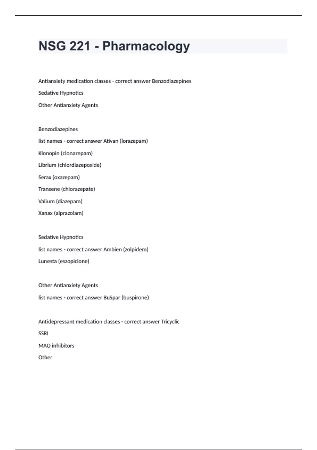 NSG 221 - PharmacologyAntianxiety medication classes - correct answer Benzodiazepines Sedative Hypnotics Other Antianxiety Agents Benzodiazepines list names - correct answer Ativan (lorazepam) Klonopin (clonazepam) Librium (chlordiazepoxide) Serax (oxazepam) Tranxene (chlorazepate) Valium (diazepam) Xanax (alprazolam) Sedative Hypnotics list names - correct answer Ambien (zolpidem) Lunesta (eszopiclone) Other Antianxiety Agents list names - correct answer BuSpar (buspirone) Antidepressant medication classes - correct answer Tricyclic SSRI MAO inhibitors