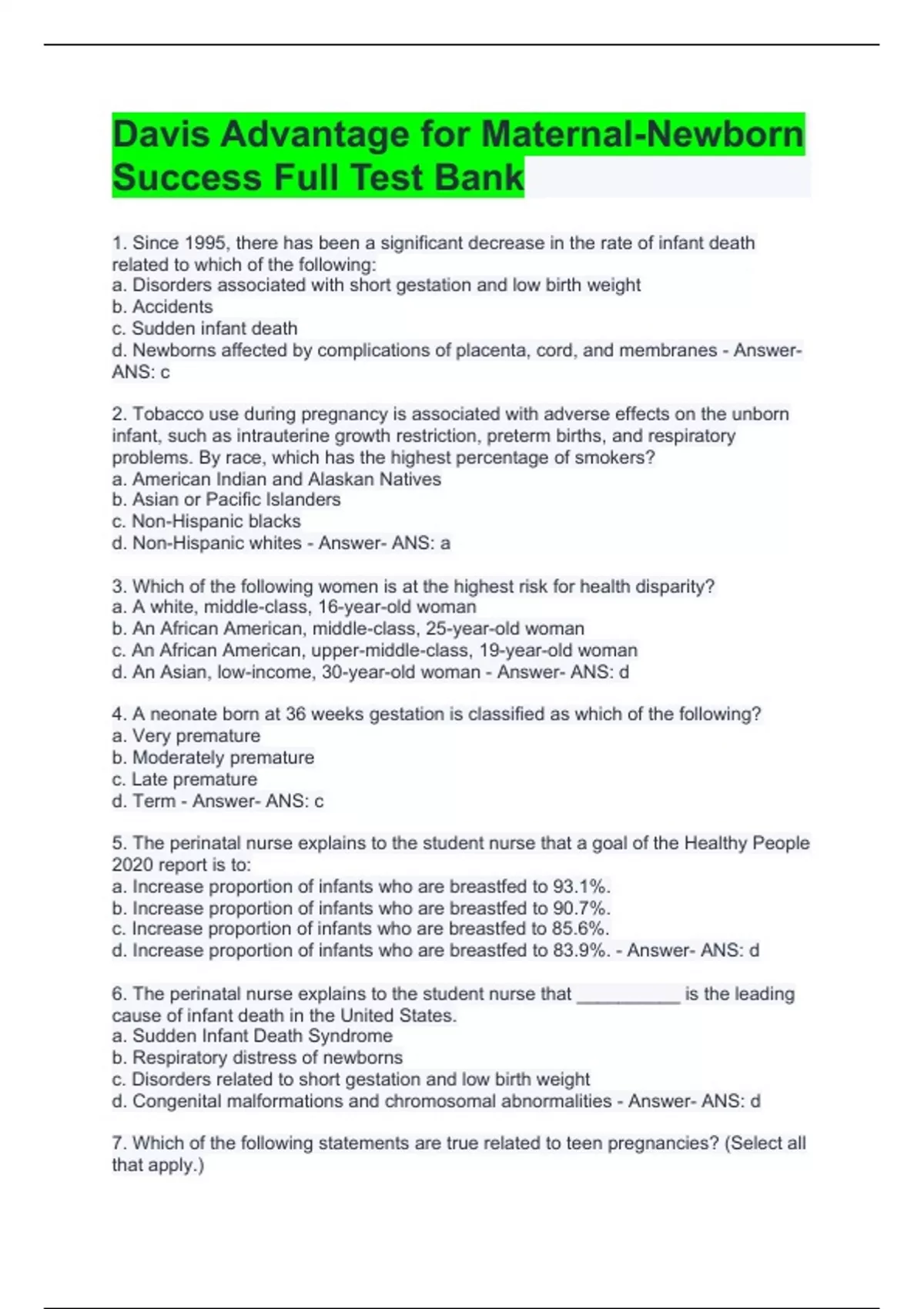 Davis Advantage for Maternal-Newborn Success Full Test Bank 1. Since 1995, there has been a significant decrease in the rate of infant death related to which of the following: a. Disorders associated with short gestation and low birth weight b. Accidents c. Sudden infant death d. Newborns affected by complications of placenta, cord, and membranes - Answer- ANS: c 2. Tobacco use during pregnancy is associated with adverse effects on the unborn infant, such as intrauterine growth restriction, preterm births, and respiratory problems. By race, which has the highest percentage of smokers? a. American Indian and Alaskan Natives b. Asian or Pacific Islanders c. Non-Hispanic blacks d. Non-Hispanic whites - Answer- ANS: a 3. Which of the following women is at the highest risk for health disparity? a. A white, middle-class, 16-year-old woman b. An African American, middle-class, 25-year-old woman c. An African American, upper-middle-class, 19-year-old woman d. An Asian, low-income, 30-year-old woman - Answer- ANS: d 4. A neonate born at 36 weeks gestation is classified as which of the following? a. Very premature b. Moderately premature c. Late premature d. Term - Answer- ANS: c 5. The perinatal nurse explains to the student nurse that a goal of the Healthy People 2020 report is to: a. Increase proportion of infants who are breastfed to 93.1%. b. Increase proportion of infants who are breastfed to 90.7%. c. Increase proportion of infants who are breastfed to 85.6%. d. Increase proportion of infants who are breastfed to 83.9%. - Answer- ANS: d 6. The perinatal nurse explains to the student nurse that __________ is the leading cause of infant death in the United States. a. Sudden Infant Death Syndrome b. Respiratory distress of newborns c. Disorders related to short gestation and low birth weight d. Congenital malformations and chromosomal abnormalities - Answer- ANS: d 7. Which of the following statements are true related to teen pregnancies? (Select all that apply.) a. Teen mothers are at higher risk for HIV.