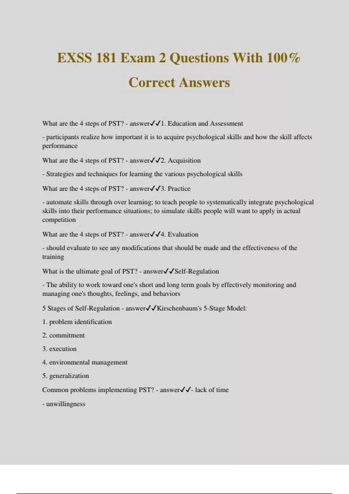 EXSS 181 Exam 2 Questions With 100% Correct Answers What are the 4 steps of PST? - answer1. Education and Assessment - participants realize how important it is to acquire psychological skills and how the skill affects performance What are the 4 steps of PST? - answer2. Acquisition - Strategies and techniques for learning the various psychological skills What are the 4 steps of PST? - answer3. Practice - automate skills through over learning; to teach people to systematically integrate psychological skills into their performance situations; to simulate skills people will want to apply in actual competition What are the 4 steps of PST? - answer4. Evaluation - should evaluate to see any modifications that should be made and the effectiveness of the training What is the ultimate goal of PST? - answerSelf-Regulation - The ability to work toward one's short and long term goals by effectively monitoring and managing one's thoughts, feelings, and behaviors 5 Stages of Self-Regulation - answerKirschenbaum's 5-Stage Model: 1. problem identification 2. commitment 3. execution 4. environmental management 5. generalization Common problems implementing PST? - answer- lack of time - unwillingness Deep Breathing - answer- method of arousal/anxiety control - easy, effective - decreases muscle tension - best use in competition: break in action PMR (Progressive Muscle Relaxation) - answer- method of arousal/anxiety control - objective is to teach/train contrast between tension and relaxation - full program is 30 min but can do abbreviated program - helps relax on-site in competition - Major Premises: 1. tension and relaxation can't occur at the same time 2. relaxation of body contributes to relaxation of mind Autogenic Training - answer- method of arousal/anxiety control - longer time to learn, extensive practice - focuses on warmth and heaviness rather than tension and relaxation - aims to produce 6 sensations: - heaviness in extremities - warmth in extremities - regulation of heart rate - regulation of breathing - abdominal warmth - cool forehead Biofeedback - answer- visual and/or auditory feedback of muscle activity, skin temperature, brain wave, heart rate Common coping strategies of elite athletes? - answer- thought stopping - narrowing focus - rational thinking and self-talk - positive focus - social support - PST - time management On-site coping/relaxation techniques? - answer- smile in response to tension - enjoy the situation - slow down - stay focused in the present - be prepared Techniques that can increase athlete arousal? - answer- increase breathing rate - act energized - self-talk - energizing music - energizing imagery - pre competitive workout Imagery - answer- creating or recreating an experience on the mind - recall from memory pieces stored and shape them into useful information - imagery = recall + construction - visual - auditory - tactile - olfactory 2 characteristics of skilled/effective imagery? - answer- vividness - controllability Internal vs. External Imagery - answer- Internal: seeing things in a 1st person view - External: seeing things from a 3rd person view Common Uses of Imagery - answer- improve concentration - enhance motivation - build confidence - control emotional response