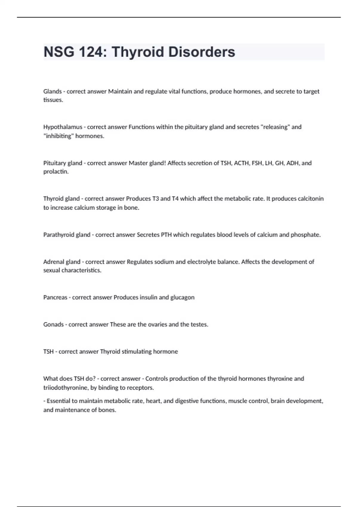 NSG 124: Thyroid DisordersGlands - correct answer Maintain and regulate vital functions, produce hormones, and secrete to target tissues. Hypothalamus - correct answer Functions within the pituitary gland and secretes "releasing" and "inhibiting" hormones. Pituitary gland - correct answer Master gland! Affects secretion of TSH, ACTH, FSH, LH, GH, ADH, and prolactin. Thyroid gland - correct answer Produces T3 and T4 which affect the metabolic rate. It produces calcitonin to increase calcium storage in bone. Parathyroid gland - correct answer Secretes PTH which regulates blood levels of calcium and phosphate. Adrenal gland - correct answer Regulates sodium and electrolyte balance. Affects the development of sexual characteristics. Pancreas - correct answer Produces insulin and glucagon Gonads - correct answer These are the ovaries and the testes. TSH - correct answer Thyroid stimulating hormone What does TSH do? - correct answer - Controls production of the thyroid hormones thyroxine and triiodothyronine, by binding to receptors. - Essential to maintain metabolic rate, heart, and digestive functions, muscle control, brain development, and maintenance of bones.