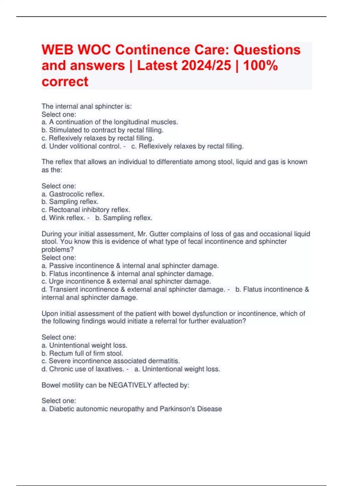 WEB WOC Continence Care: Questions and answers | Latest 2024/25 | 100% correct