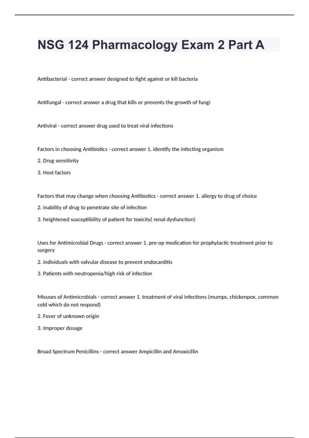 NSG 124 Pharmacology Exam 2 Part AAntibacterial - correct answer designed to fight against or kill bacteria Antifungal - correct answer a drug that kills or prevents the growth of fungi Antiviral - correct answer drug used to treat viral infections Factors in choosing Antibiotics - correct answer 1. identify the infecting organism 2. Drug sensitivity 3. Host factors Factors that may change when choosing Antibiotics - correct answer 1. allergy to drug of choice 2. inability of drug to penetrate site of infection 3. heightened susceptibility of patient for toxicity( renal dysfunction) Uses for Antimicrobial Drugs - correct answer 1. pre-op medication for prophylactic treatment prior to surgery 2. individuals with valvular disease to prevent endocarditis 3. Patients with neutropenia/high risk of infection Misuses of Antimicrobials - correct answer 1. treatment of viral infections (mumps, chickenpox, common cold which do not respond) 2. Fever of unknown origin 3. Improper dosage