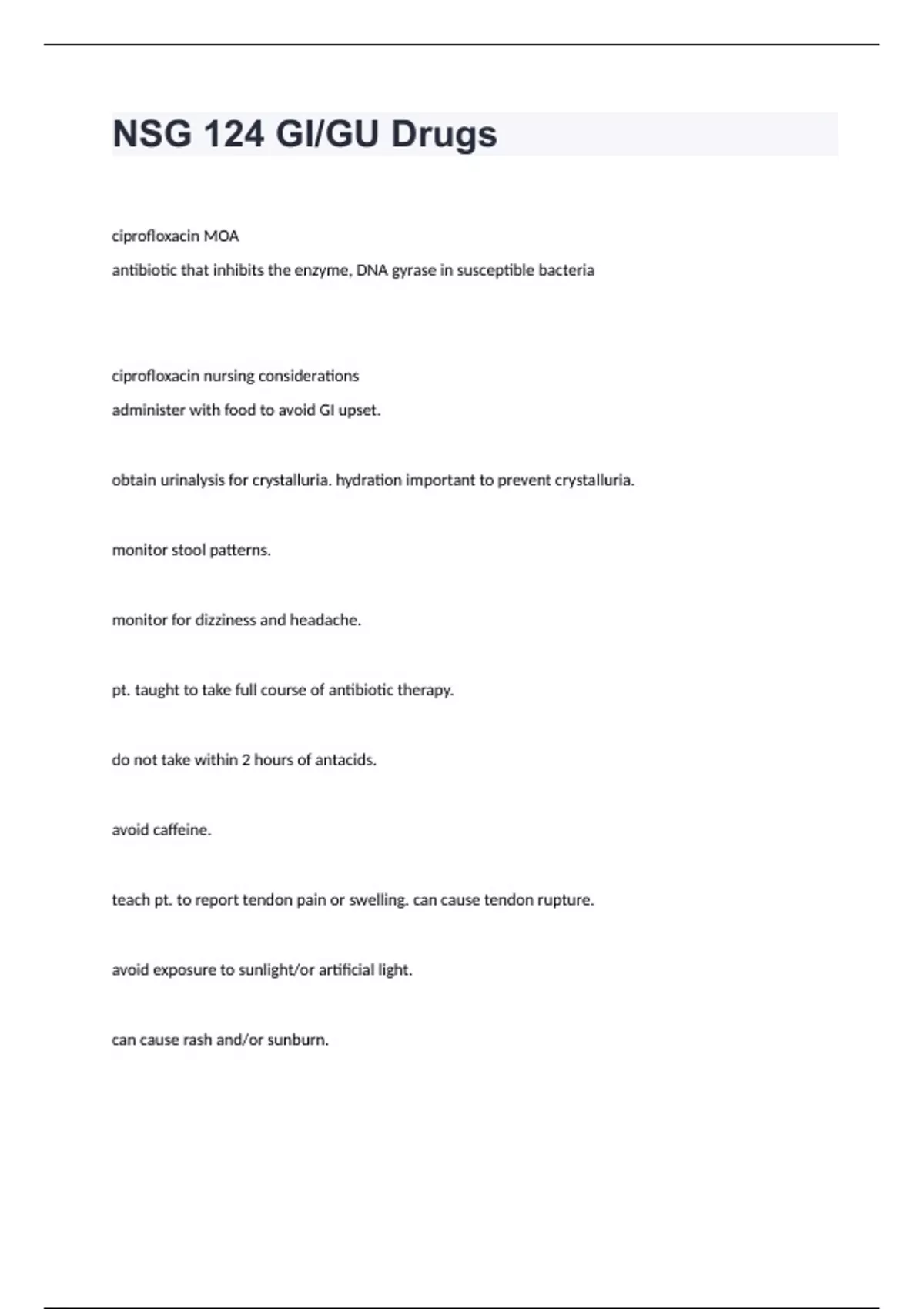 NSG 124 GI/GU Drugsciprofloxacin MOA antibiotic that inhibits the enzyme, DNA gyrase in susceptible bacteria ciprofloxacin nursing considerations administer with food to avoid GI upset. obtain urinalysis for crystalluria. hydration important to prevent crystalluria. monitor stool patterns. monitor for dizziness and headache. pt. taught to take full course of antibiotic therapy. do not take within 2 hours of antacids. avoid caffeine. teach pt. to report tendon pain or swelling. can cause tendon rupture. avoid exposure to sunlight/or artificial light.