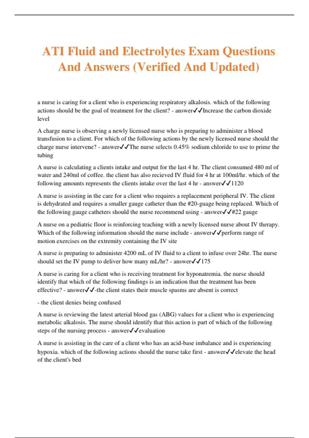 ATI Fluid and Electrolytes Exam Questions And Answers (Verified And Updated) a nurse is caring for a client who is experiencing respiratory alkalosis. which of the following actions should be the goal of treatment for the client? - answerIncrease the carbon dioxide level A charge nurse is observing a newly licensed nurse who is preparing to administer a blood transfusion to a client. For which of the following actions by the newly licensed nurse should the charge nurse intervene? - answerThe nurse selects 0.45% sodium chloride to use to prime the tubing A nurse is calculating a clients intake and output for the last 4 hr. The client consumed 480 ml of water and 240ml of coffee. the client has also recieved IV fluid for 4 hr at 100ml/hr. which of the following amounts represents the clients intake over the last 4 hr - answer1120 A nurse is assisting in the care for a client who requires a replacement peripheral IV. The client is dehydrated and requires a smaller gauge catheter than the #20-guage being replaced. Which of the following gauge catheters should the nurse recommend using - answer#22 gauge A nurse on a pediatric floor is reinforcing teaching with a newly licensed nurse about IV therapy. Which of the following information should the nurse include - answerperform range of motion exercises on the extremity containing the IV site A nurse is preparing to administer 4200 mL of IV fluid to a client to infuse over 24hr. The nurse should set the IV pump to deliver how many mL/hr? - answer175 A nurse is caring for a client who is receiving treatment for hyponatremia. the nurse should identify that which of the following findings is an indication that the treatment has been effective? - answer-the client states their muscle spasms are absent is correct - the client denies being confused A nurse is reviewing the latest arterial blood gas (ABG) values for a client who is experiencing metabolic alkalosis. The nurse should identify that this action is part of which of the following steps of the nursing process - answerevaluation A nurse is assisting in the care of a client who has an acid-base imbalance and is experiencing hypoxia. which of the following actions should the nurse take first - answerelevate the head of the client's bed