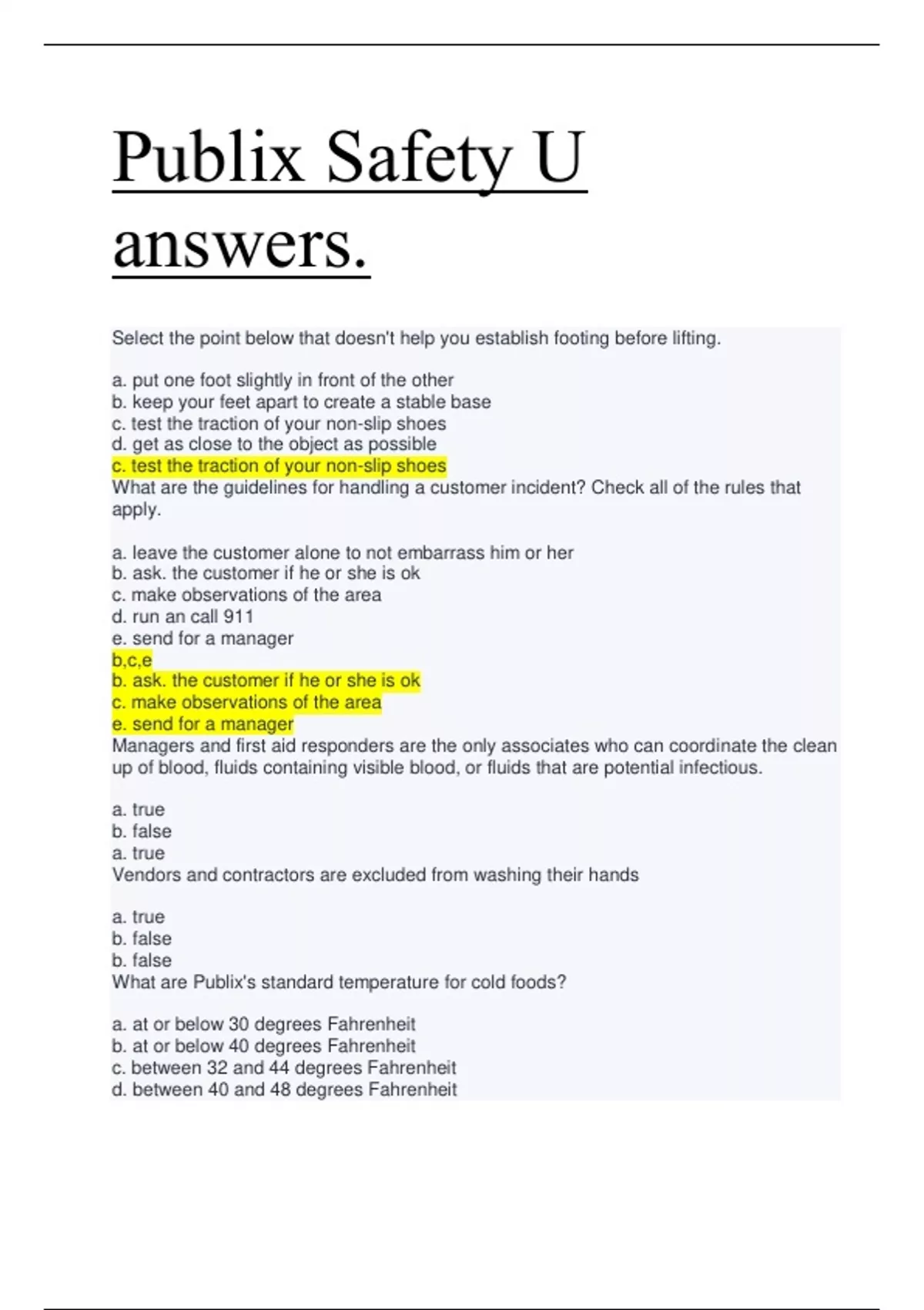 b. at or below 40 degrees Fahrenheit What are Publix's standard temperature for hot foods? a. between 120 and 144 degrees Fahrenheit b. at or above 140 degrees Fahrenheit c. between 142 and 148 degrees Fahrenheit d. at or below 160 degrees Fahrenheit b. at or above 140 degrees Fahrenheit What do you do if you find a hot or cold item on a dry grocery shelf? a. make sure no customers are looking and then put it back where it belongs b. touch the packaging and if it still feels hot (or cold) return it c. find a manager and give them the item to deicide if it's okay to re-shelve d. throw it away immediately c. find a manager and give them the item to deicide if it's okay to re-shelve Which of the following listed below do you not have to report to your manager? a. E.Coli b. Hepatitis A virus c. Headache d. Shigella species c. Headache Which of the following isn't a food safety hazard? a. physical b. chemical c. genetic d. biological c. genetic How often should you wash your hands? a. frequently b. at least three times during your shift c. whenever you feel like your hands are dirty after handling raw foods a. frequently To identify a handwashing sink. you should look for a. hand soap b. paper towels c. both hot and cold water d. all of the above d. all of the above Not all foodborne illnesses are preventab