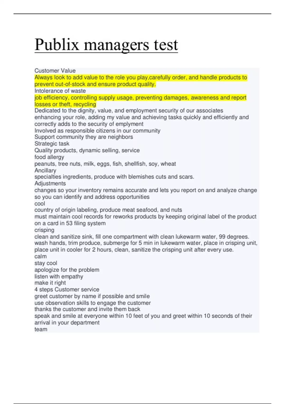 changes so your inventory remains accurate and lets you report on and analyze change so you can identify and address opportunities cool country of origin labeling, produce meat seafood, and nuts must maintain cool records for reworks products by keeping original label of the product on a card in 53 filing system crisping clean and sanitize sink, fill one compartment with clean lukewarm water, 99 degrees. wash hands, trim produce, submerge for 5 min in lukewarm water, place in crisping unit, place unit in cooler for 2 hours, clean, sanitize the crisping unit after every use. calm stay cool apologize for the problem listen with empathy make it right 4 steps Customer service greet customer by name if possible and smile use observation skills to engage the customer thanks the customer and invite them back speak and smile at everyone within 10 feet of you and greet within 10 seconds of their arrival in your department team