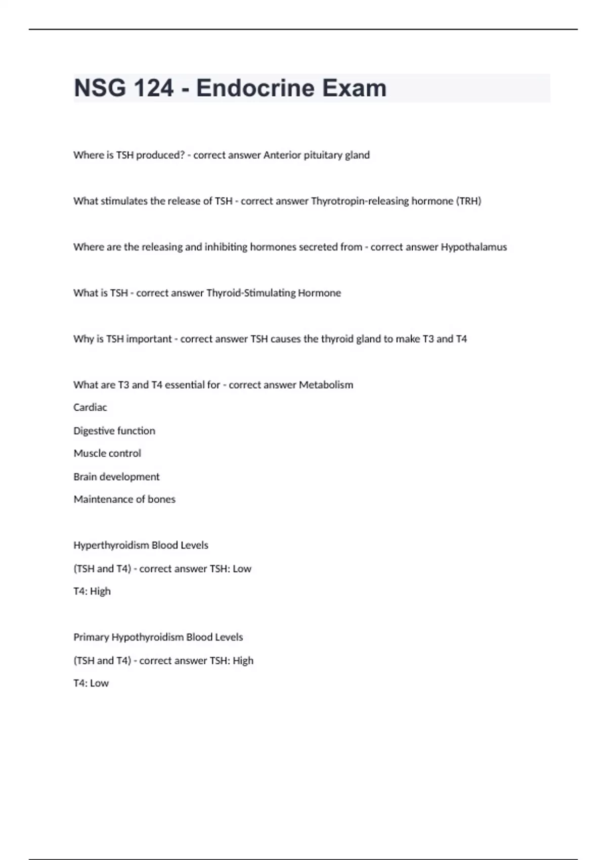 NSG 124 - Endocrine ExamWhere is TSH produced? - correct answer Anterior pituitary gland What stimulates the release of TSH - correct answer Thyrotropin-releasing hormone (TRH) Where are the releasing and inhibiting hormones secreted from - correct answer Hypothalamus What is TSH - correct answer Thyroid-Stimulating Hormone Why is TSH important - correct answer TSH causes the thyroid gland to make T3 and T4 What are T3 and T4 essential for - correct answer Metabolism Cardiac Digestive function Muscle control Brain development Maintenance of bones Hyperthyroidism Blood Levels (TSH and T4) - correct answer TSH: Low T4: High Primary Hypothyroidism Blood Levels (TSH and T4) - correct answer TSH: High T4: Low
