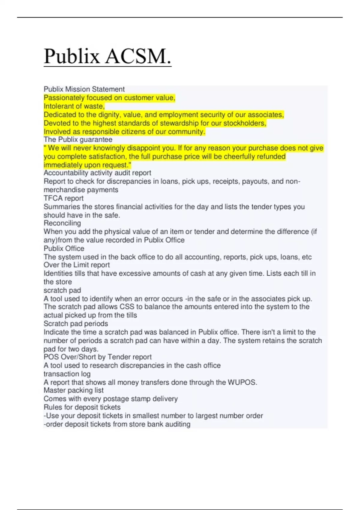 Identities tills that have excessive amounts of cash at any given time. Lists each till in the store scratch pad A tool used to identify when an error occurs -in the safe or in the associates pick up. The scratch pad allows CSS to balance the amounts entered into the system to the actual picked up from the tills Scratch pad periods Indicate the time a scratch pad was balanced in Publix office. There isn't a limit to the number of periods a scratch pad can have within a day. The system retains the scratch pad for two days. POS Over/Short by Tender report A tool used to research discrepancies in the cash office transaction log A report that shows all money transfers done through the WUPOS. Master packing list Comes with every postage stamp delivery Rules for deposit tickets -Use your deposit tickets in smallest number to largest number order -order deposit tickets from store bank auditing