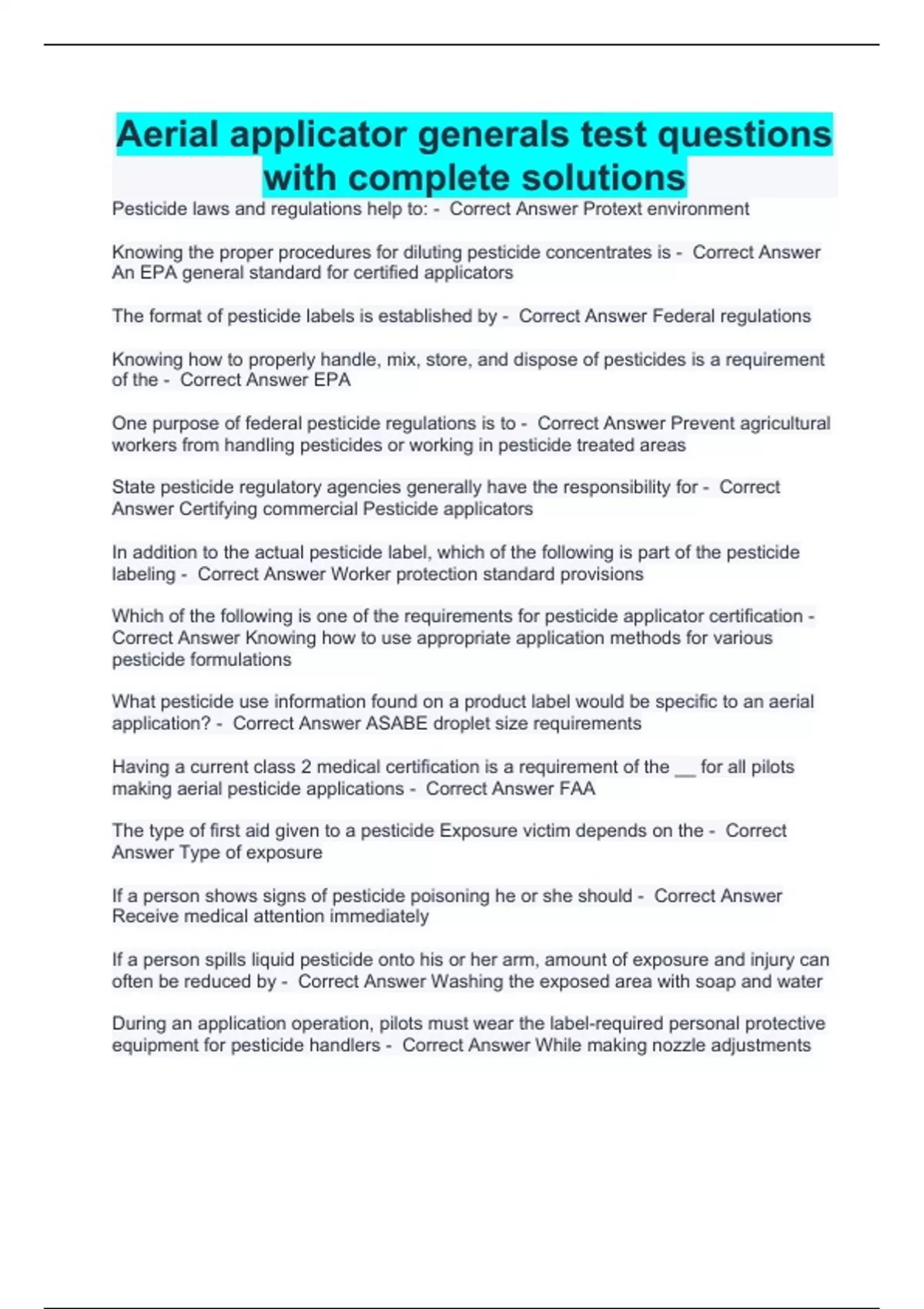 Aerial applicator generals test questions with complete solutions Pesticide laws and regulations help to: - Correct Answer Protext environment Knowing the proper procedures for diluting pesticide concentrates is - Correct Answer An EPA general standard for certified applicators The format of pesticide labels is established by - Correct Answer Federal regulations Knowing how to properly handle, mix, store, and dispose of pesticides is a requirement of the - Correct Answer EPA One purpose of federal pesticide regulations is to - Correct Answer Prevent agricultural workers from handling pesticides or working in pesticide treated areas State pesticide regulatory agencies generally have the responsibility for - Correct Answer Certifying commercial Pesticide applicators In addition to the actual pesticide label, which of the following is part of the pesticide labeling - Correct Answer Worker protection standard provisions Which of the following is one of the requirements for pesticide applicator certification - Correct Answer Knowing how to use appropriate application methods for various pesticide formulations What pesticide use information found on a product label would be specific to an aerial application? - Correct Answer ASABE droplet size requirements Having a current class 2 medical certification is a requirement of the __ for all pilots making aerial pesticide applications - Correct Answer FAA The type of first aid given to a pesticide Exposure victim depends on the - Correct Answer Type of exposure