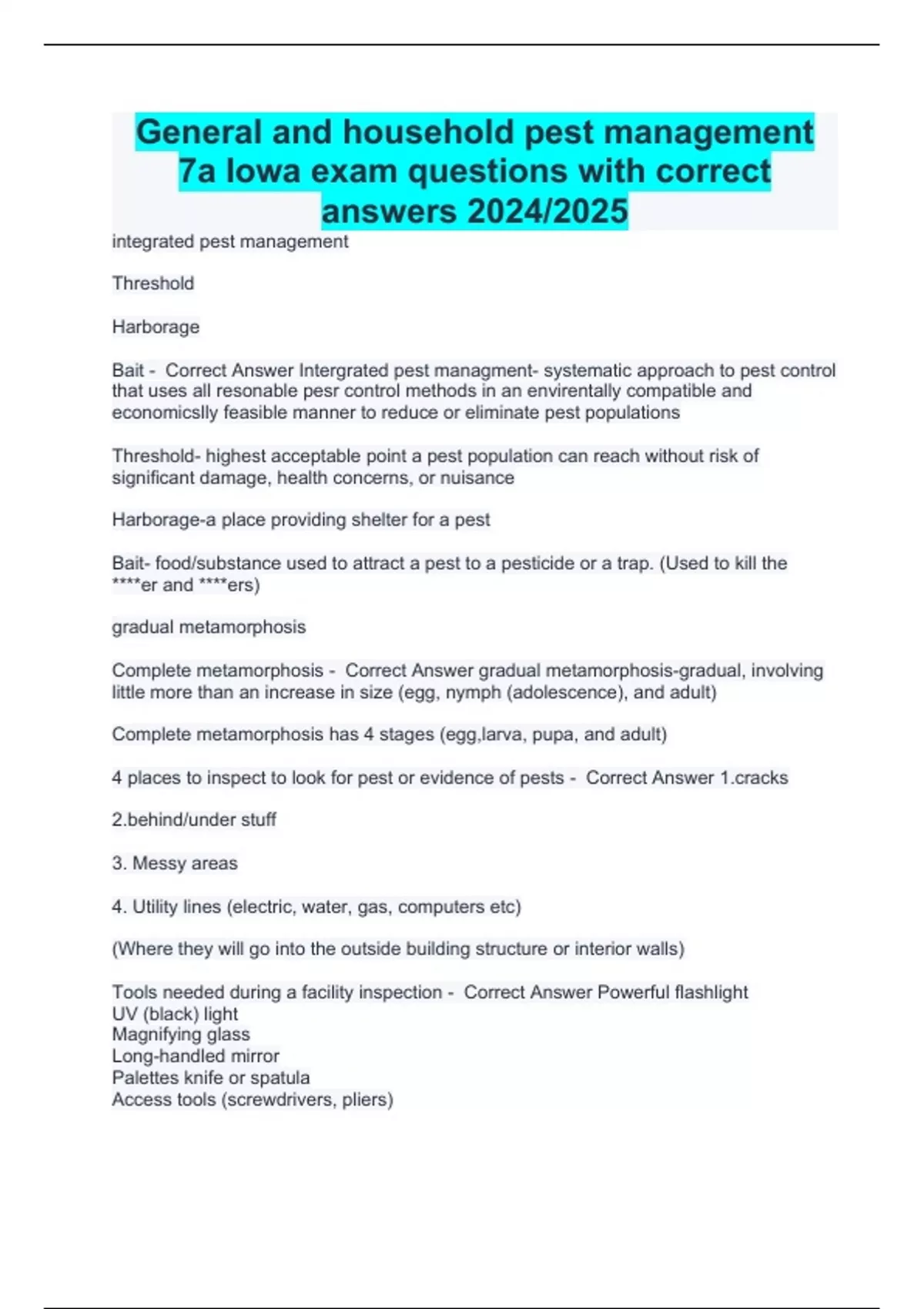General and household pest management 7a Iowa exam questions with correct answers 2024/2025 integrated pest management Threshold Harborage Bait - Correct Answer Intergrated pest managment- systematic approach to pest control that uses all resonable pesr control methods in an envirentally compatible and economicslly feasible manner to reduce or eliminate pest populations Threshold- highest acceptable point a pest population can reach without risk of significant damage, health concerns, or nuisance Harborage-a place providing shelter for a pest Bait- food/substance used to attract a pest to a pesticide or a trap. (Used to kill the ****er and ****ers) gradual metamorphosis Complete metamorphosis - Correct Answer gradual metamorphosis-gradual, involving little more than an increase in size (egg, nymph (adolescence), and adult) Complete metamorphosis has 4 stages (egg,larva, pupa, and adult) 4 places to inspect to look for pest or evidence of pests - Correct Answer s d/under stuff 3. Messy areas 4. Utility lines (electric, water, gas, computers etc) (Where they will go into the outside building structure or interior walls) Tools needed during a facility inspection - Correct Answer Powerful flashlight UV (black) light Magnifying glass Long-handled mirror Palettes knife or spatula Access tools (screwdrivers, pliers)