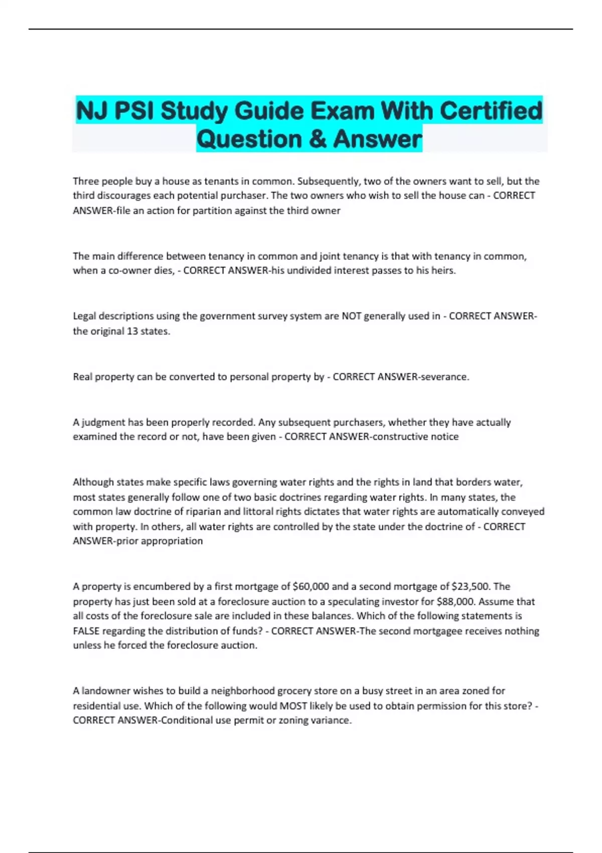 NJ PSI Study Guide Exam With Certified Question & Answer Three people buy a house as tenants in common. Subsequently, two of the owners want to sell, but the third discourages each potential purchaser. The two owners who wish to sell the house can - CORRECT ANSWER-file an action for partition against the third owner The main difference between tenancy in common and joint tenancy is that with tenancy in common, when a co-owner dies, - CORRECT ANSWER-his undivided interest passes to his heirs. Legal descriptions using the government survey system are NOT generally used in - CORRECT ANSWERthe original 13 states.