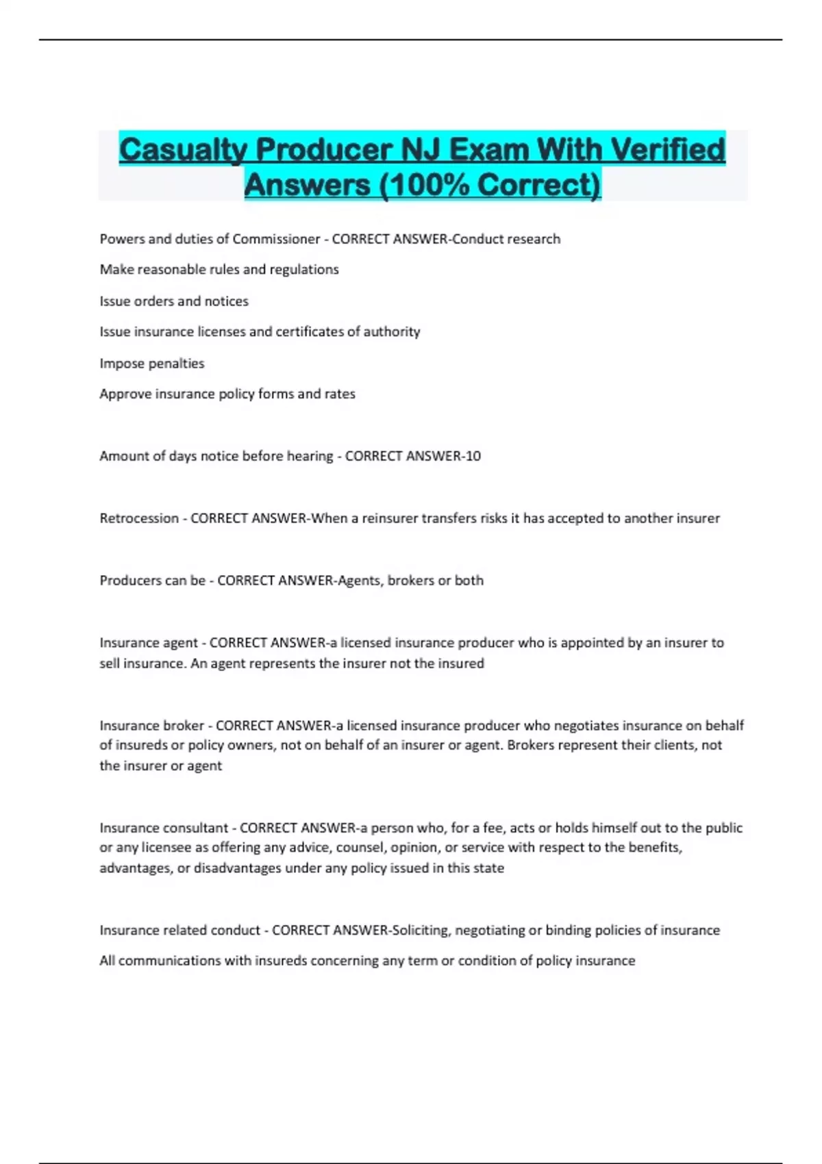 Casualty Producer NJ Exam With Verified Answers (100% Correct) Powers and duties of Commissioner - CORRECT ANSWER-Conduct research Make reasonable rules and regulations Issue orders and notices Issue insurance licenses and certificates of authority Impose penalties Approve insurance policy forms and rates Amount of days notice before hearing - CORRECT ANSWER-10