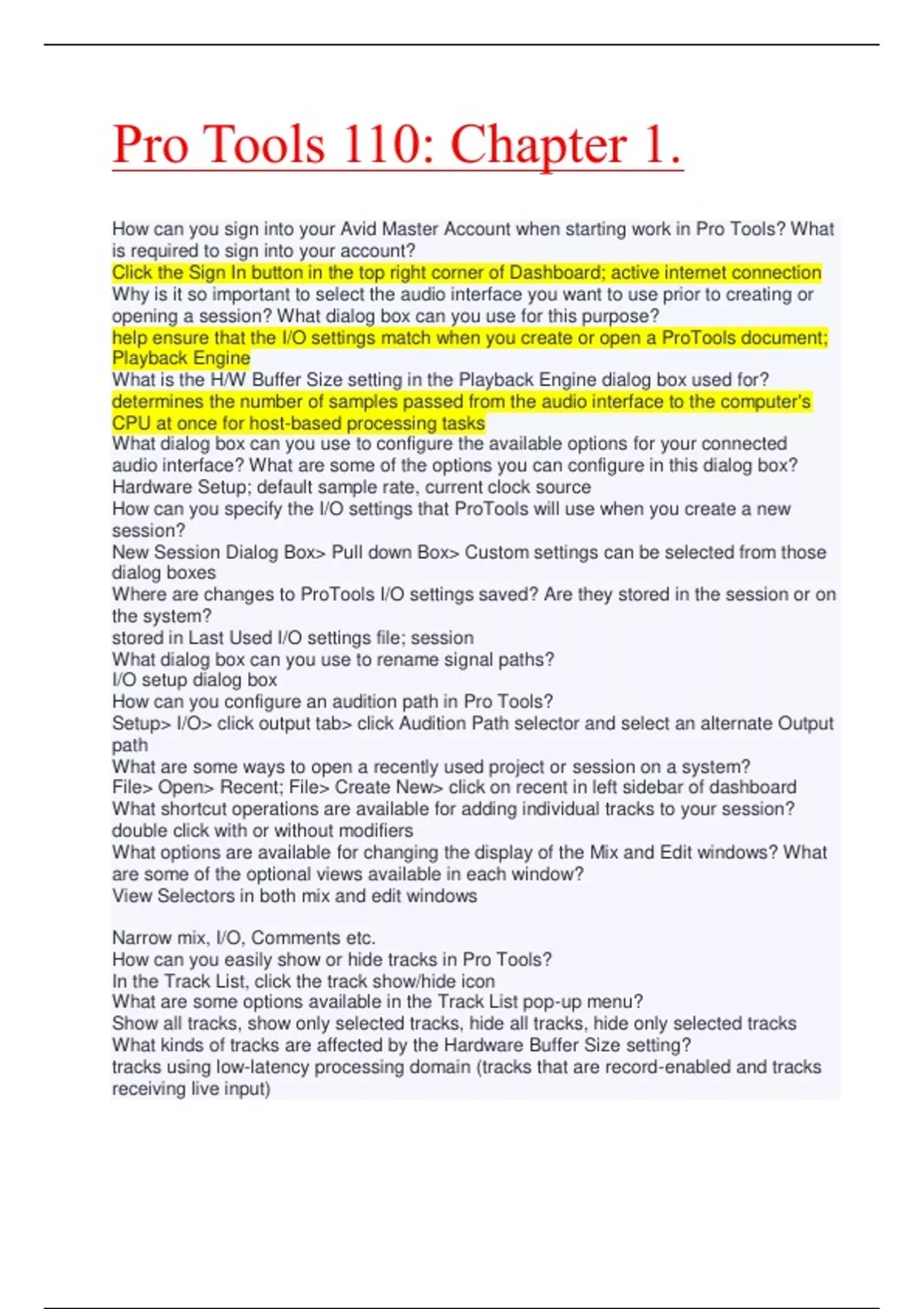 New Session Dialog Box> Pull down Box> Custom settings can be selected from those dialog boxes Where are changes to ProTools I/O settings saved? Are they stored in the session or on the system? stored in Last Used I/O settings file; session What dialog box can you use to rename signal paths? I/O setup dialog box How can you configure an audition path in Pro Tools? Setup> I/O> click output tab> click Audition Path selector and select an alternate Output path What are some ways to open a recently used project or session on a system? File> Open> Recent; File> Create New> click on recent in left sidebar of dashboard What shortcut operations are available for adding individual tracks to your session? double click with or without modifiers What options are available for changing the display of the Mix and Edit windows? What are some of the optional views available in each window? View Selectors in both mix and edit windows Narrow mix, I/O, Comments etc. How can you easily show or hide tracks in Pro Tools? In the Track List, click the track show/hide icon What are some options available in the Track List pop-up menu? Show all tracks, show only selected tracks, hide all tracks, hide only selected tracks What kinds of tracks are affected by the Hardware Buffer Size setting? tracks using low-latency processing domain (tracks that are record-enabled and tracks receiving live input)
