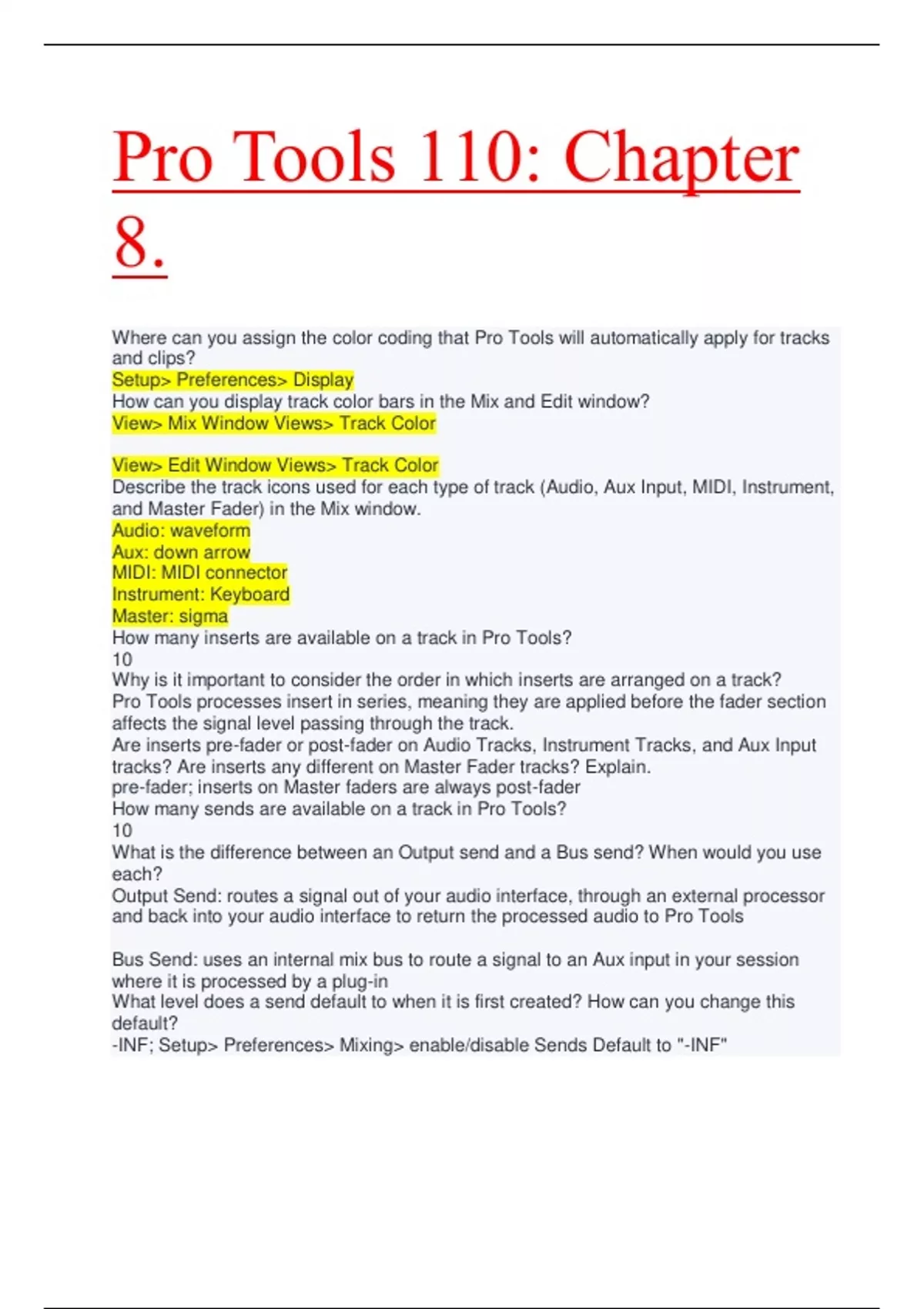 How can you copy a send from one track to another track and duplicate its settings? What considerations might apply? option drag; when moving from mono to stereo tracks, send pan automation will be lost, when replacing an existing send, all automation on the existing send will be replaced Which type of plug-in effects are generally used on inserts? Which are generally used with sends? Why? EQ, gain-based processors and dynamic processors; time-based processors; sharing effects is useful when you want a common effect for multiple tracks and makes more efficient use of you processing resources What is the Librarian menu used for in a plug-in window? What is displayed in the Librarian menu when you first assign a plug-in? Why? lets you select from available presets for the current plug-in; factory default which means no preset is selected What are some of the uses of a Master Fader? How can you assign a Master Fader to the desired output or bus? control and process output mixes, monitor and meter an output level, control submit levels, apply dither; Audio Output Path Selector