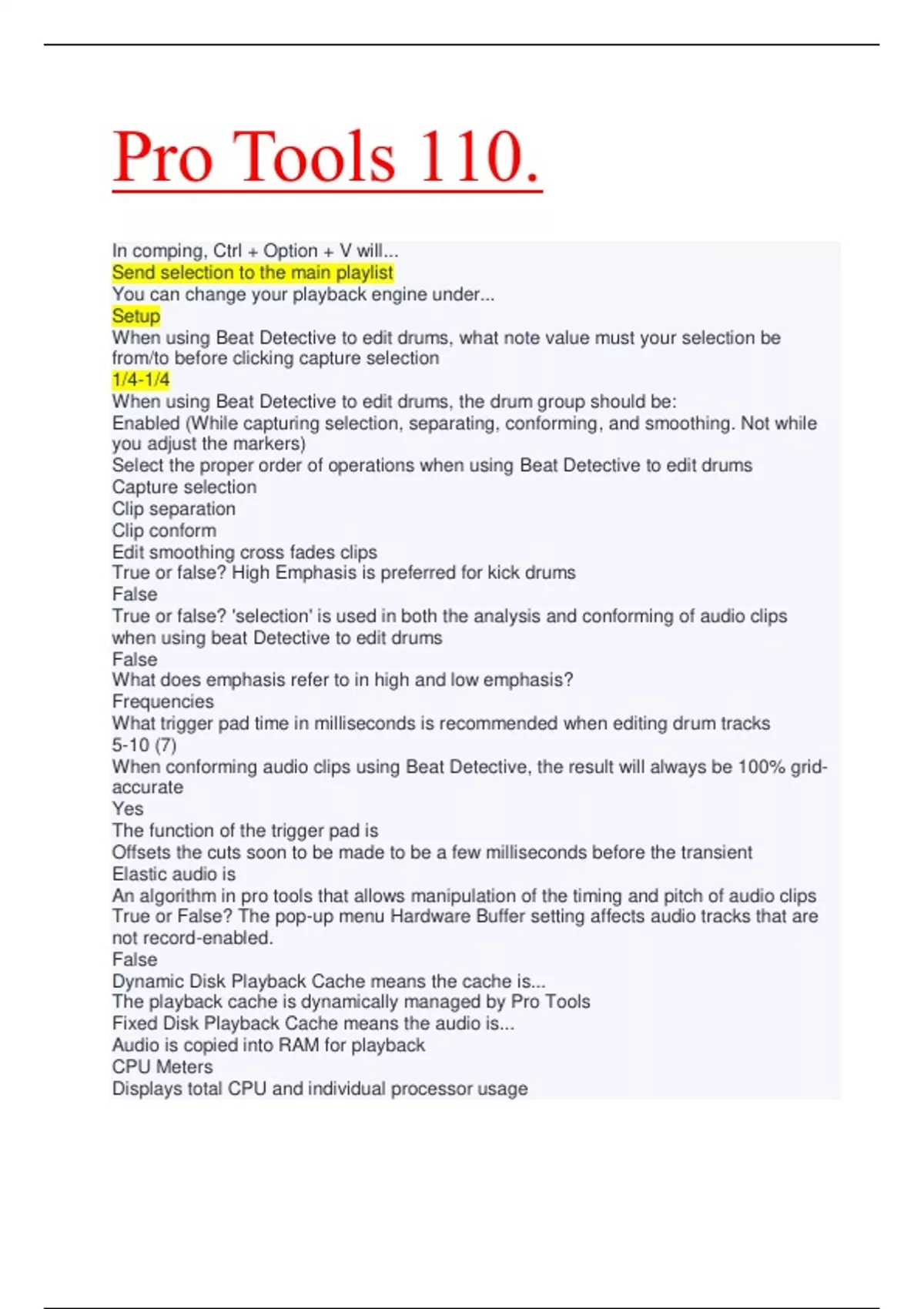 False True or false? 'selection' is used in both the analysis and conforming of audio clips when using beat Detective to edit drums False What does emphasis refer to in high and low emphasis? Frequencies What trigger pad time in milliseconds is recommended when editing drum tracks 5-10 (7) When conforming audio clips using Beat Detective, the result will always be 100% gridaccurate Yes The function of the trigger pad is Offsets the cuts soon to be made to be a few milliseconds before the transient Elastic audio is An algorithm in pro tools that allows manipulation of the timing and pitch of audio clips True or False? The pop-up menu Hardware Buffer setting affects audio tracks that are not record-enabled. False Dynamic Disk Playback Cache means the cache is... The playback cache is dynamically managed by Pro Tools Fixed Disk Playback Cache means the audio is... Audio is copied into RAM for playback CPU Meters Displays total CPU and individual processor usage