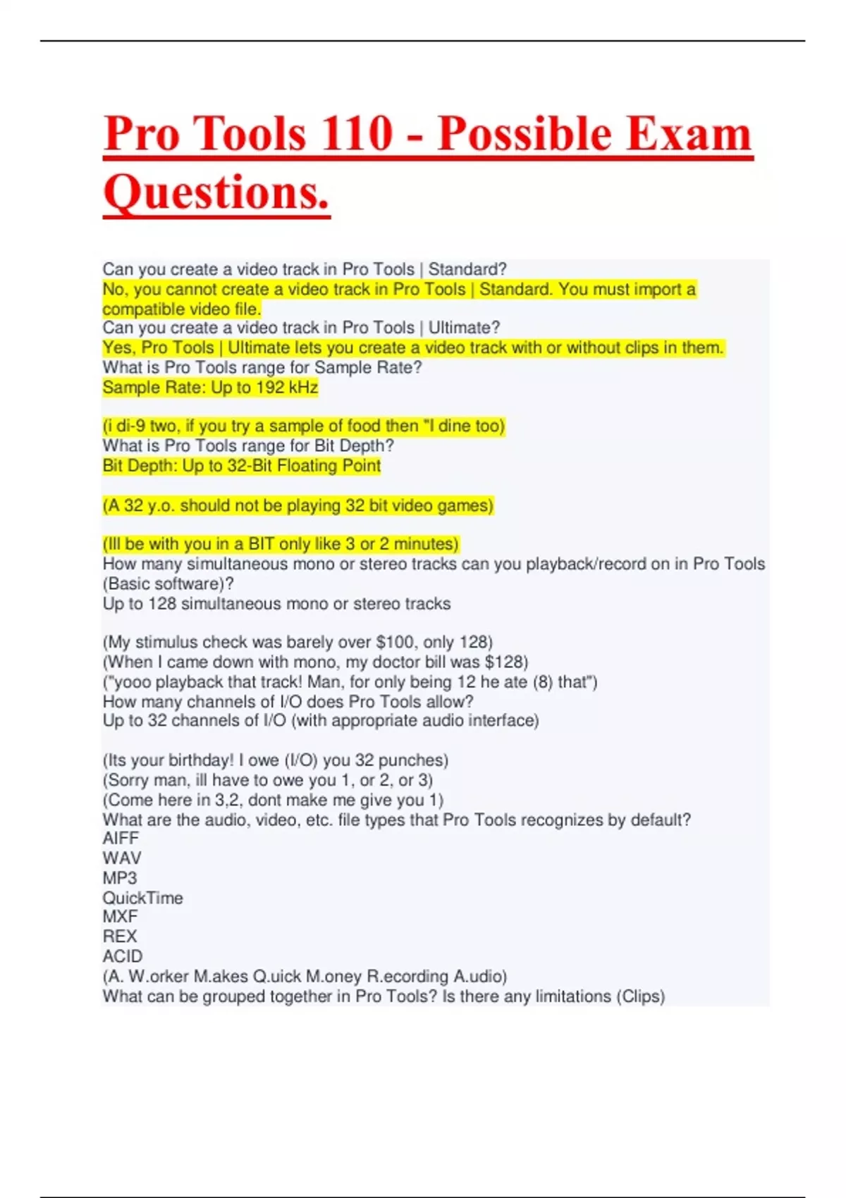 How many simultaneous mono or stereo tracks can you playback/record on in Pro Tools (Basic software)? Up to 128 simultaneous mono or stereo tracks (My stimulus check was barely over $100, only 128) (When I came down with mono, my doctor bill was $128) ("yooo playback that track! Man, for only being 12 he ate (8) that") How many channels of I/O does Pro Tools allow? Up to 32 channels of I/O (with appropriate audio interface) (Its your birthday! I owe (I/O) you 32 punches) (Sorry man, ill have to owe you 1, or 2, or 3) (Come here in 3,2, dont make me give you 1) What are the audio, video, etc. file types that Pro Tools recognizes by default? AIFF WAV MP3 QuickTime MXF REX ACID (A. W.orker M.akes Q.uick M.oney R.ecording A.udio) What can be grouped together in Pro Tools? Is there any limitations (Clips